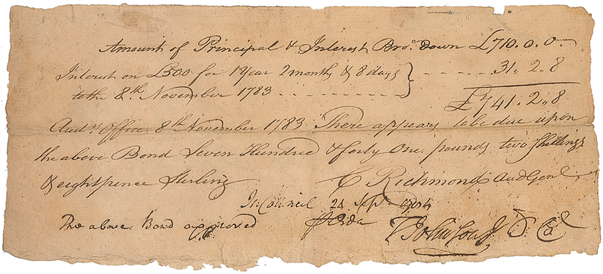 Jurist (1732-1819) who served as the first governor of Maryland and was later appointed to the Supreme Court by George Washington, serving from 1792 to 1793. Manuscript DS, signed "T. Johnson," one page, 8 x 3.5, September 24, 1784. Financial document regarding a bond of £741.2.8, approved at the conclusion by Johnson. In very good to fine, with light soiling and a small chip to the top edge.