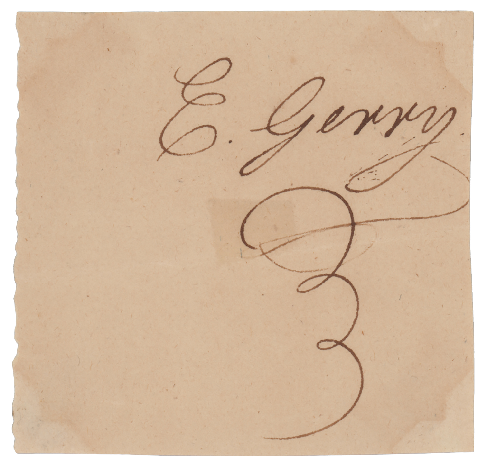 Signer of the Declaration of Independence from Massachusetts (1744-1814) who later served as vice president under James Madison. His name entered the language as a result of his support of politically advantageous redistricting, which became known as 'gerrymandering.' Ink signature, "E. Gerry," with an elaborate paraph on an off-white 2.75 x 2.72 slip, clipped from a larger document. In fine condition, with mild overall toning, and light show-through from a small piece of tape on the back. In his 1995 reference History Comes to Life, Kenneth Rendell places Gerry's autograph material into the 'rare' category among the Signers.