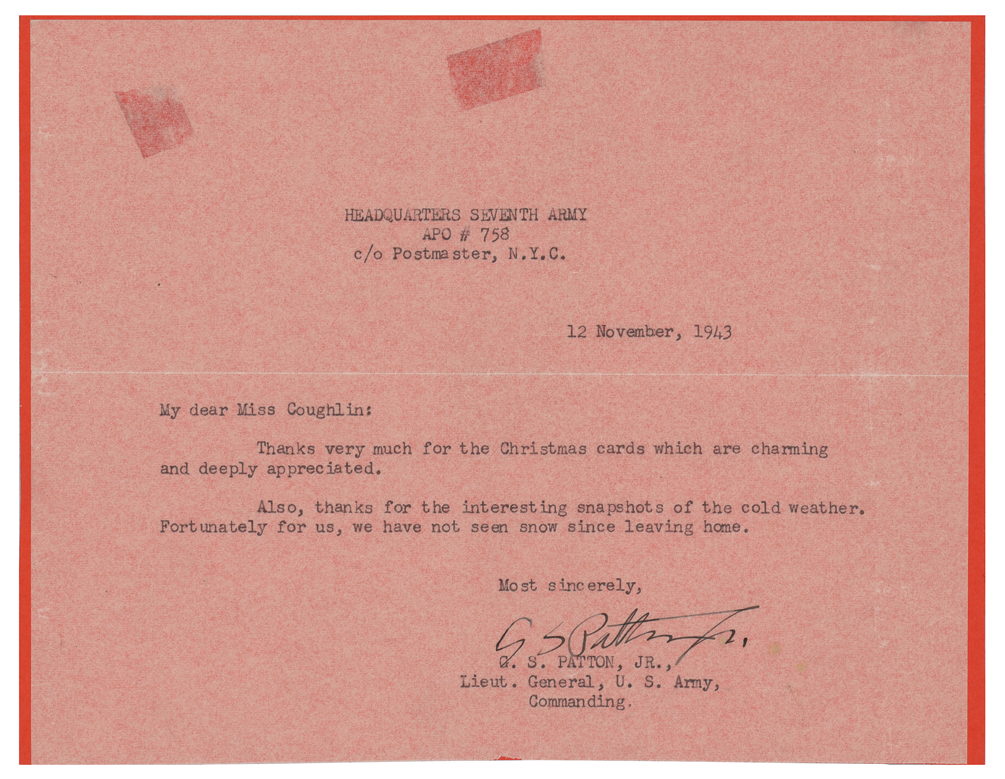World War II-dated TLS signed "G. S. Patton, Jr.," one onionskin page, 8 x 6.25, Headquarters Seventh Army letterhead, November 12, 1943. Letter of thanks to a woman. In full: "Thanks very much for the Christmas cards which are charming and deeply appreciated. Also, thanks for the interesting snapshots of the cold weather. Fortunately for us, we have not seen snow since leaving home." Letter is affixed by its top edge to a slightly larger sheet of cardstock. In fine condition, with trimmed edges, and show-through from two pieces of tape on the reverse.