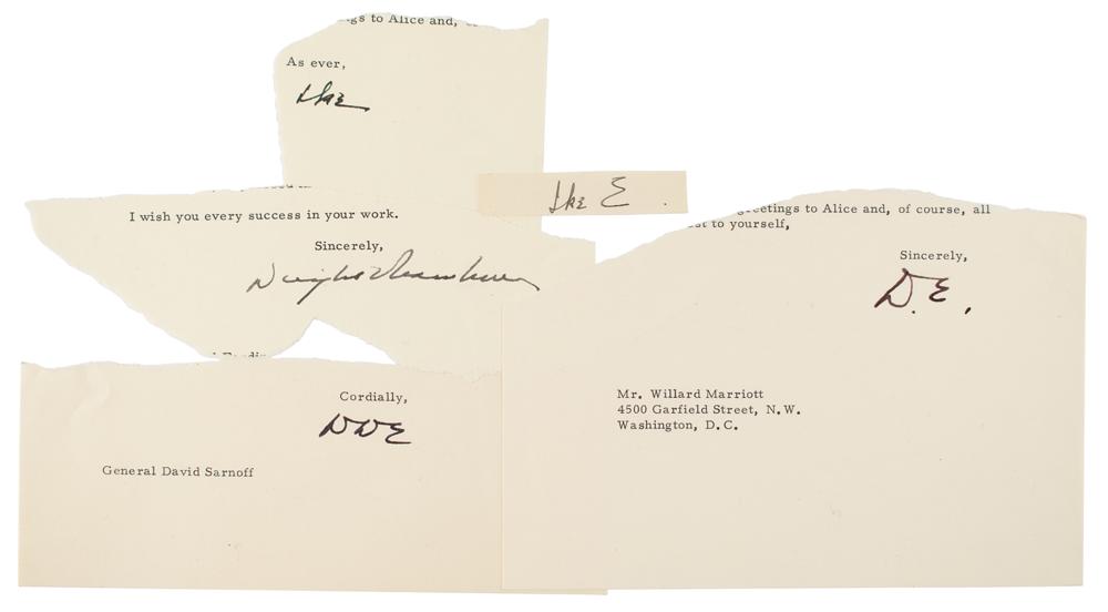 Five ink signatures of Dwight D. Eisenhower on individual off-white slips removed from the close of letters, with Eisenhower signing his name in different variations—"D. E.," "D. D. E.," "Ike," "Ike E.," and "Dwight D. Eisenhower." In overall fine condition.