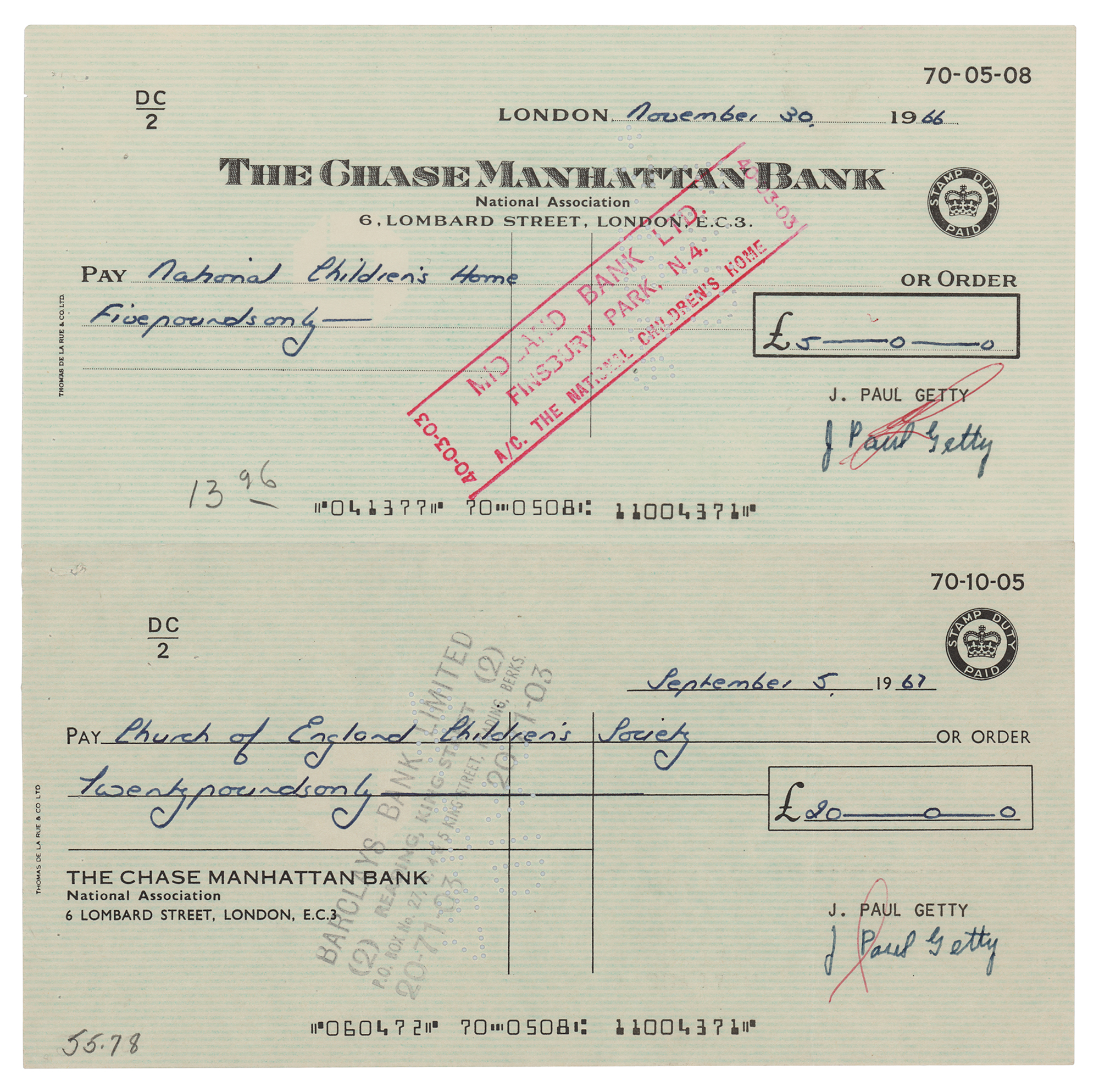 Two personal checks, 8 x 4, each filled out in another hand and signed by Getty, "J. Paul Getty," dated 1966-67. One is made out to the National Children's Home for £5, and the other is made out to the Church of England Children's Society for £20. In overall fine condition, with small cancelation notations to the signatures. A desirable pairing of charitable contributions from one of the world's richest citizens.