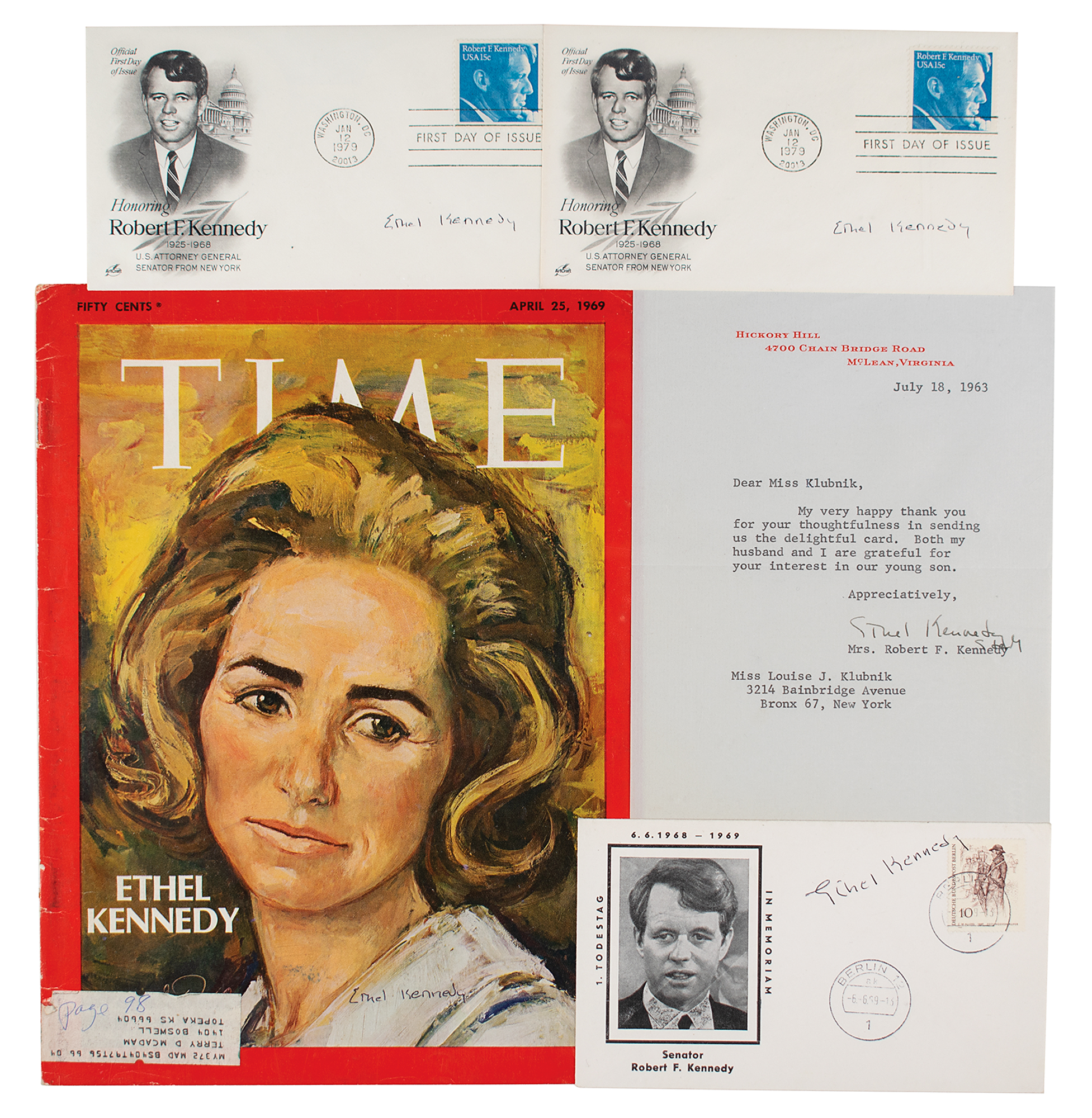 Five items signed by Ethel Kennedy, including: three covers with cachets honoring her husband Robert F. Kennedy, each signed in ballpoint; a Time magazine from April 25, 1969, signed in ballpoint; and a TLS from July 18, 1963, sending thanks for congratulations on the birth of their son Christopher. In overall fine condition. Accompanied by the original mailing envelope for the letter.