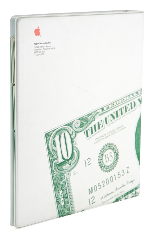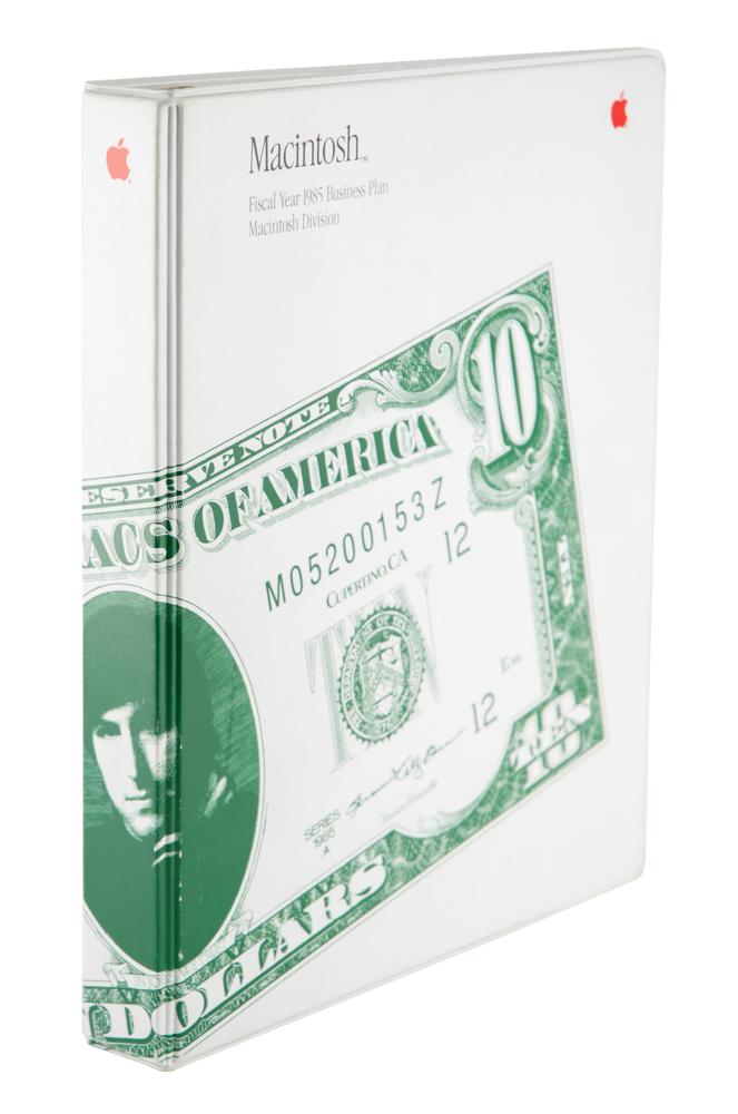 Rare custom-made binder for Apple Computer's "Fiscal Year 1985 Business Plan, Macintosh Division," 10.25 x 11.75, featuring a humorously rendered ten-dollar bill featuring Steve Jobs at the center, with "In Jobs We Trust" in the banner below. Additionally, the bill's design has multiple 'Easter egg' elements, such as "Cupertino, CA"—the location of Apple's headquarters—below the serial number, and "This note is legal tender except in Boca Raton, Florida." Inside are tabbed separators labeled "Executive Summary," "Charter," "Top Ten Objectives," "Quarterly Objectives," "Interdivisional Support," "Open Issues," "Headcount," "Operating Expenses," "Commentary," "Costs," "Capital Budget," "Organizational Chart," and "Other." Although the text of the business plan is not present, these tabs reveal some of the values and priorities of the organization during this early period. In fine condition.