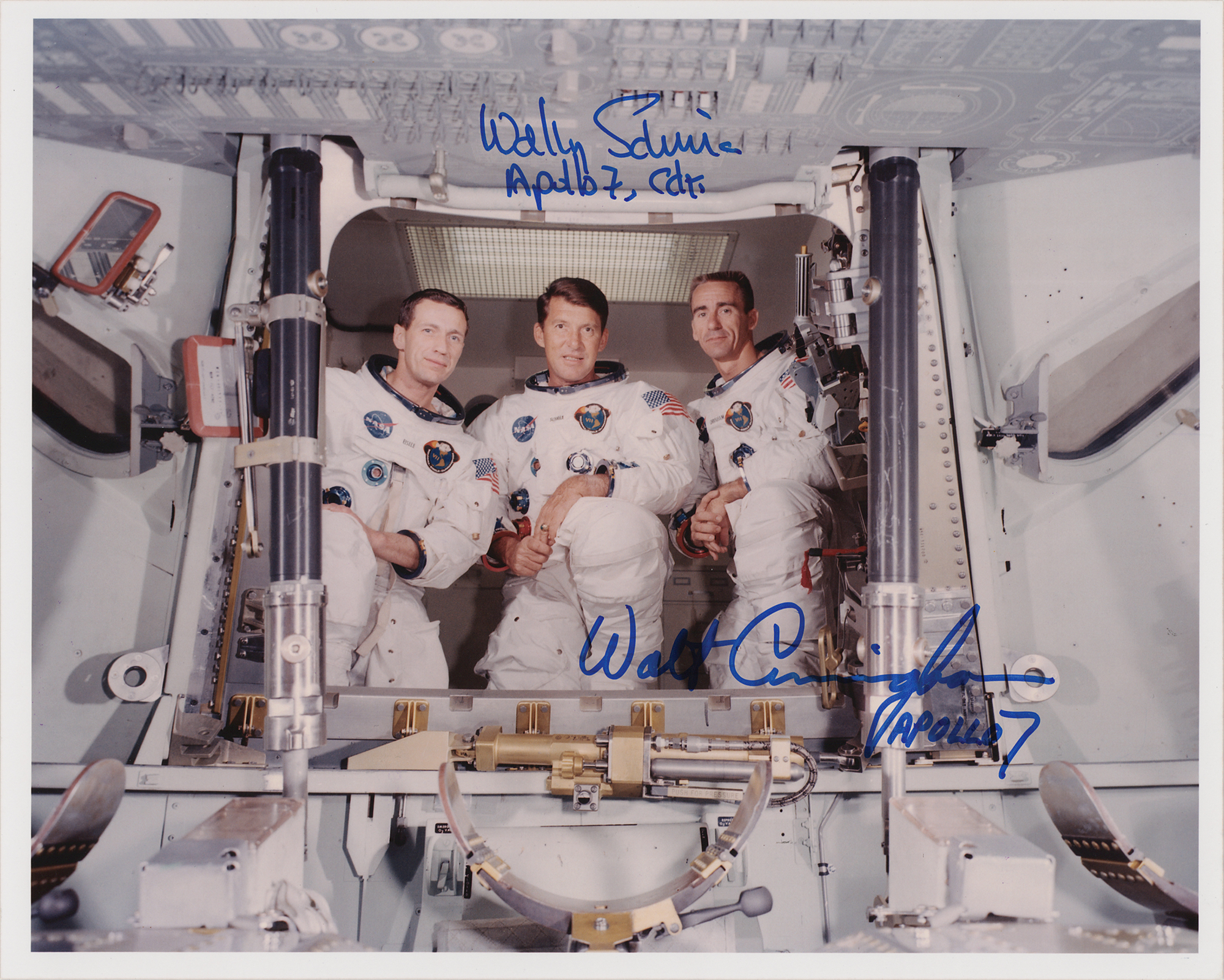 Color satin-finish 10 x 8 photo of the Apollo 7 crew posing in their white space suits and looking into their Apollo capsule, signed in blue felt tip, "Wally Schirra, Apollo 7, Cdr.," and "Walt Cunningham, Apollo 7." In very fine condition. An unusual signed pose.