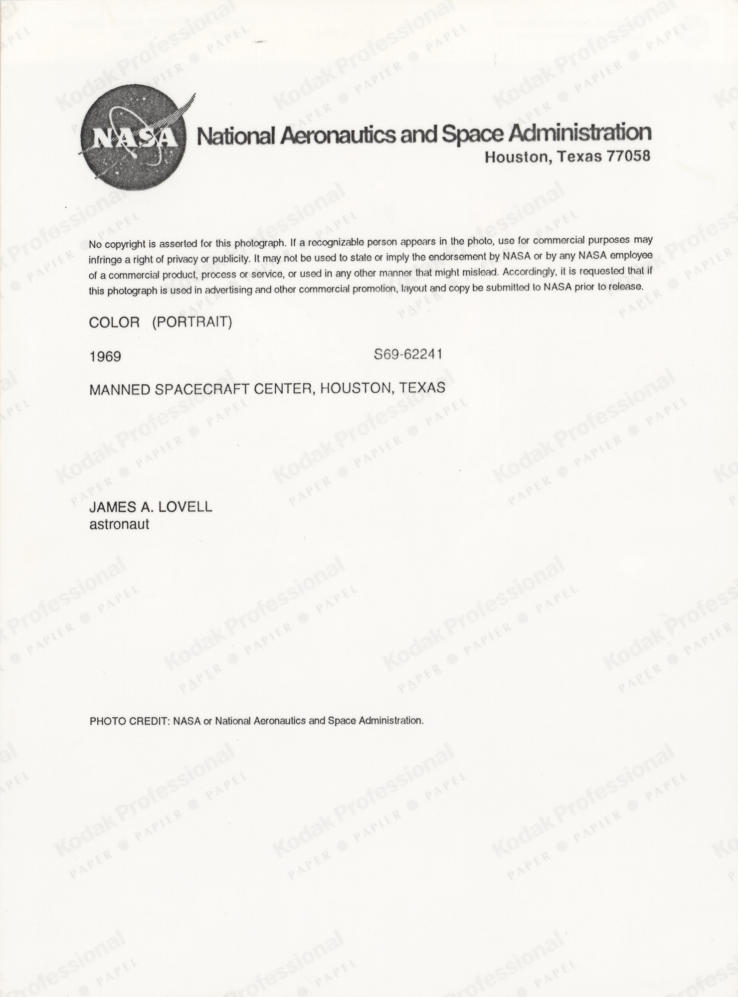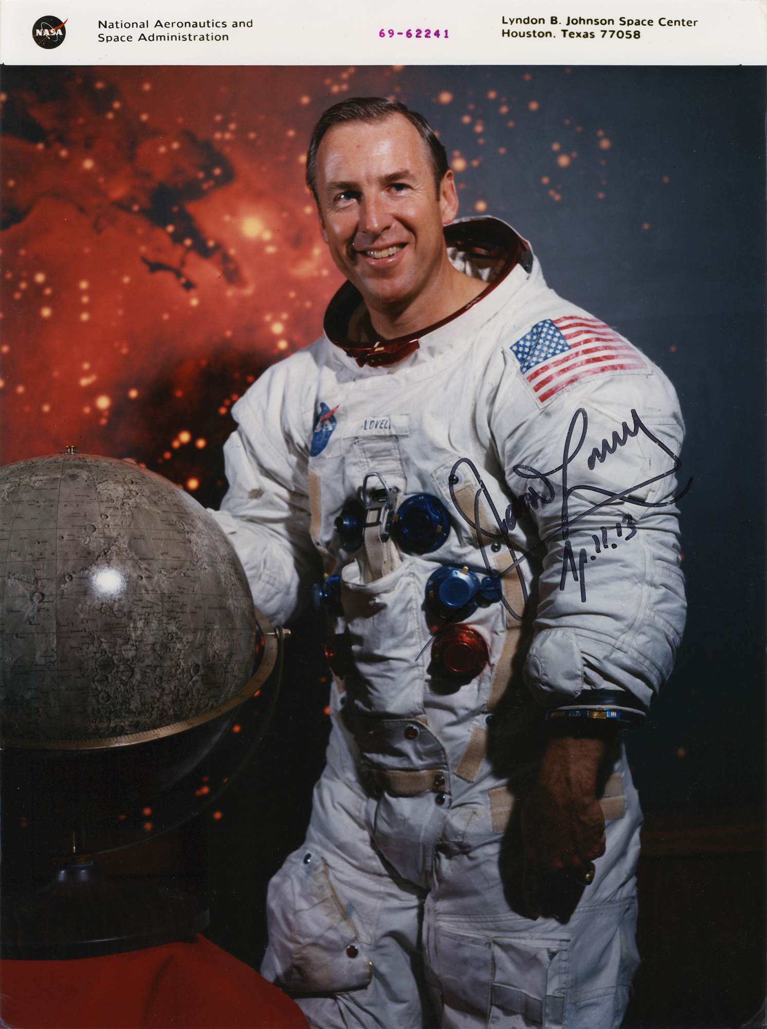 Official color glossy 8 x 10.75 red-numbered NASA photo of James Lovell posing in his white space suit with a lunar globe, signed in black felt tip, "James Lovell, Apollo 13." Reverse bears NASA text and "Kodak Professional" watermarks. In fine condition, with some small creases.