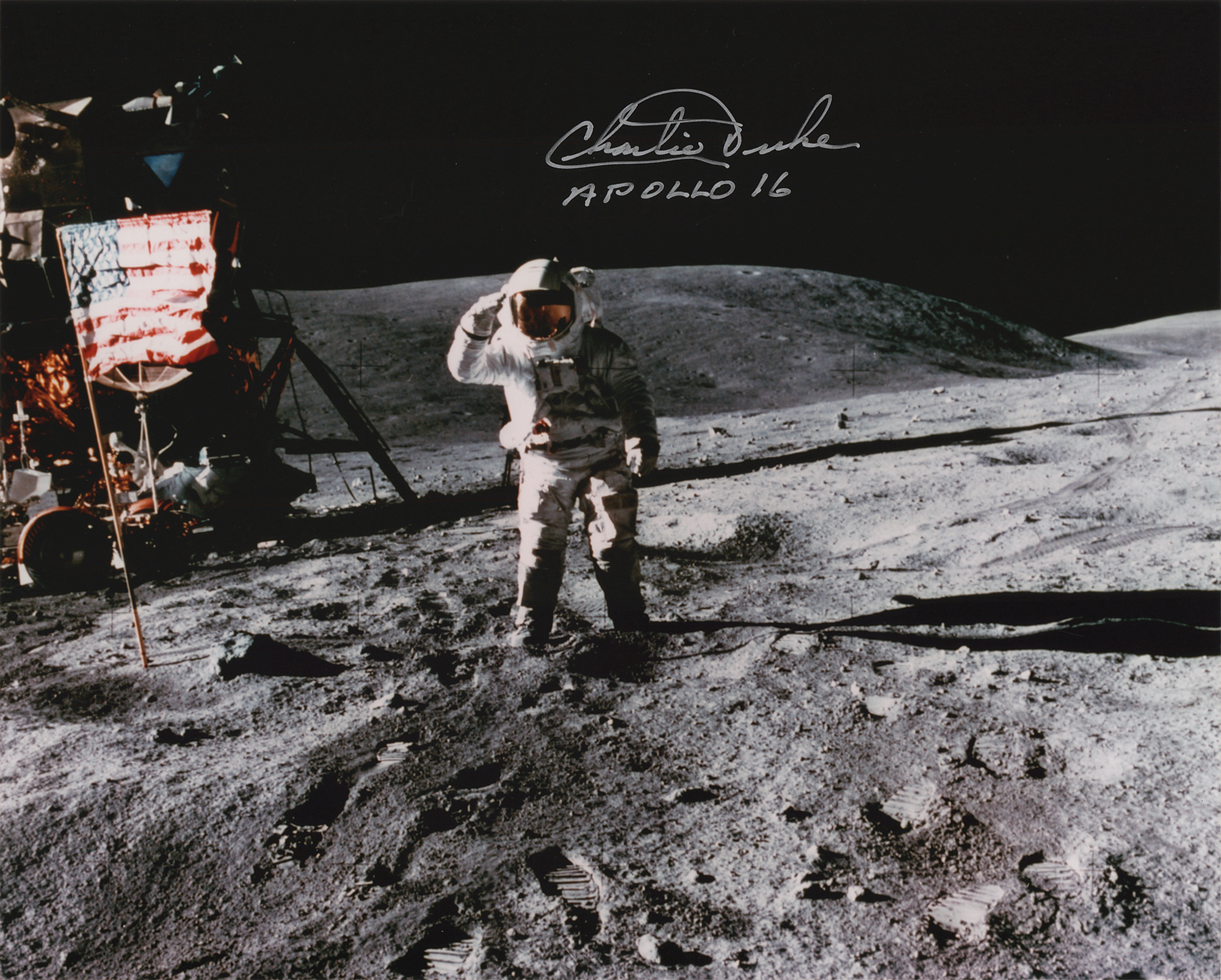 Color satin-finish 10 x 8 photo of Duke saluting the American flag on the lunar surface, signed in silver ink, "Charlie Duke, Apollo 16." In very fine condition. Accompanied by a certificate of authenticity from Novaspace.