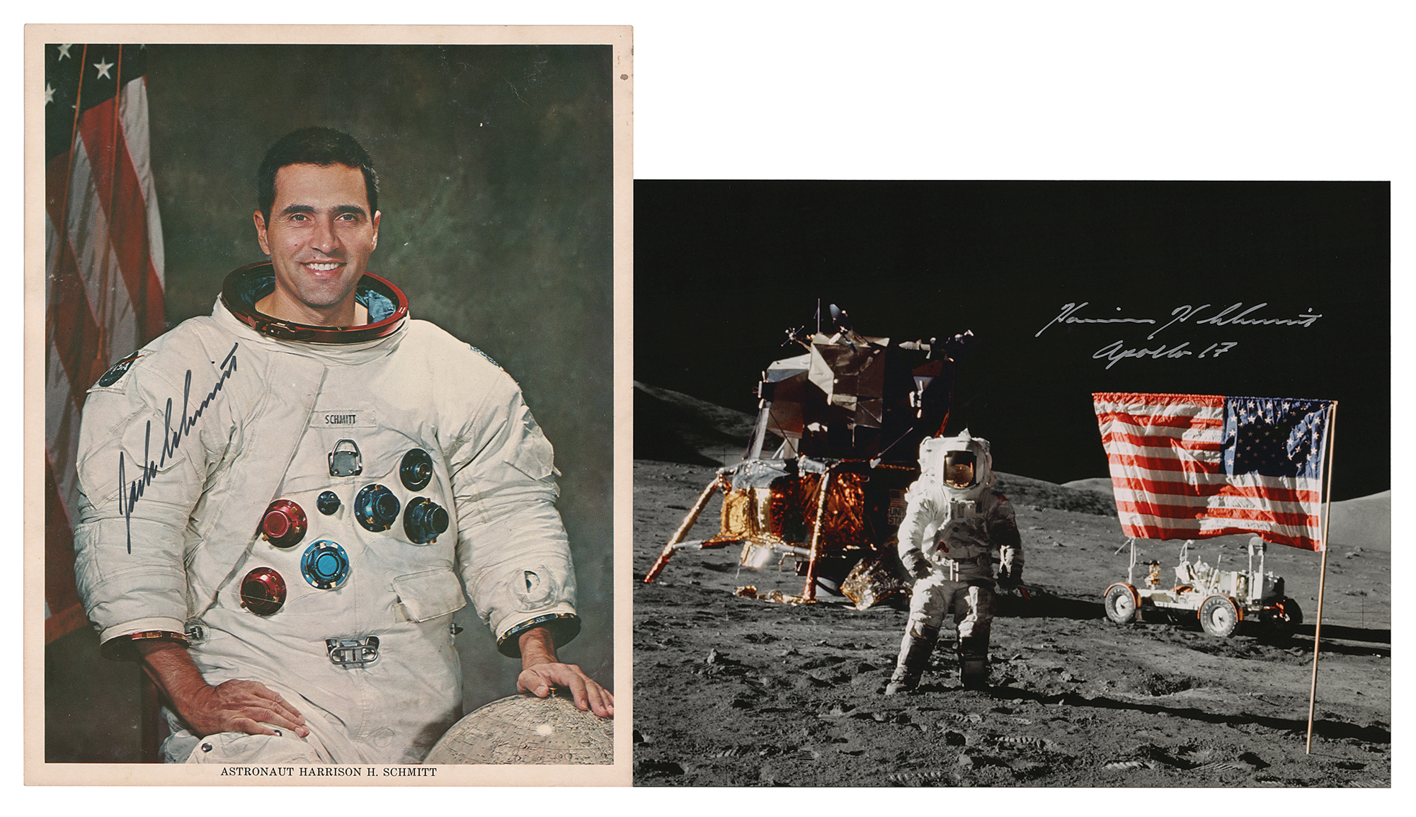 Two photos: an official color 8 x 10 NASA lithograph of Schmitt posing in his white space suit, signed in black felt tip, "Jack Schmitt"; and a color satin-finish 10 x 8 photo of Schmitt posing near the American flag, moon rover, and lunar module during an Apollo 17 EVA, signed in silver ink, "Harrison H. Schmitt, Apollo 17." In overall very good to fine condition, with overall dampstaining and rippling to the portrait. Accompanied by a certificate of authenticity from Novaspace.