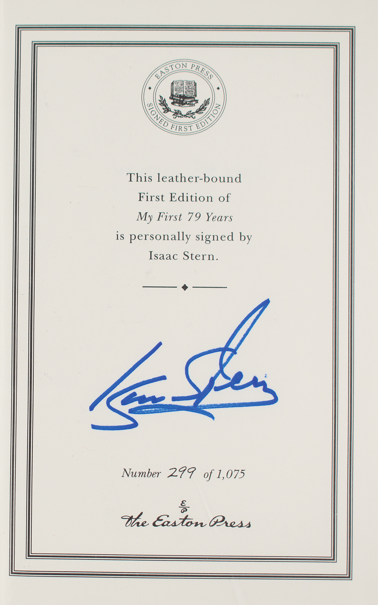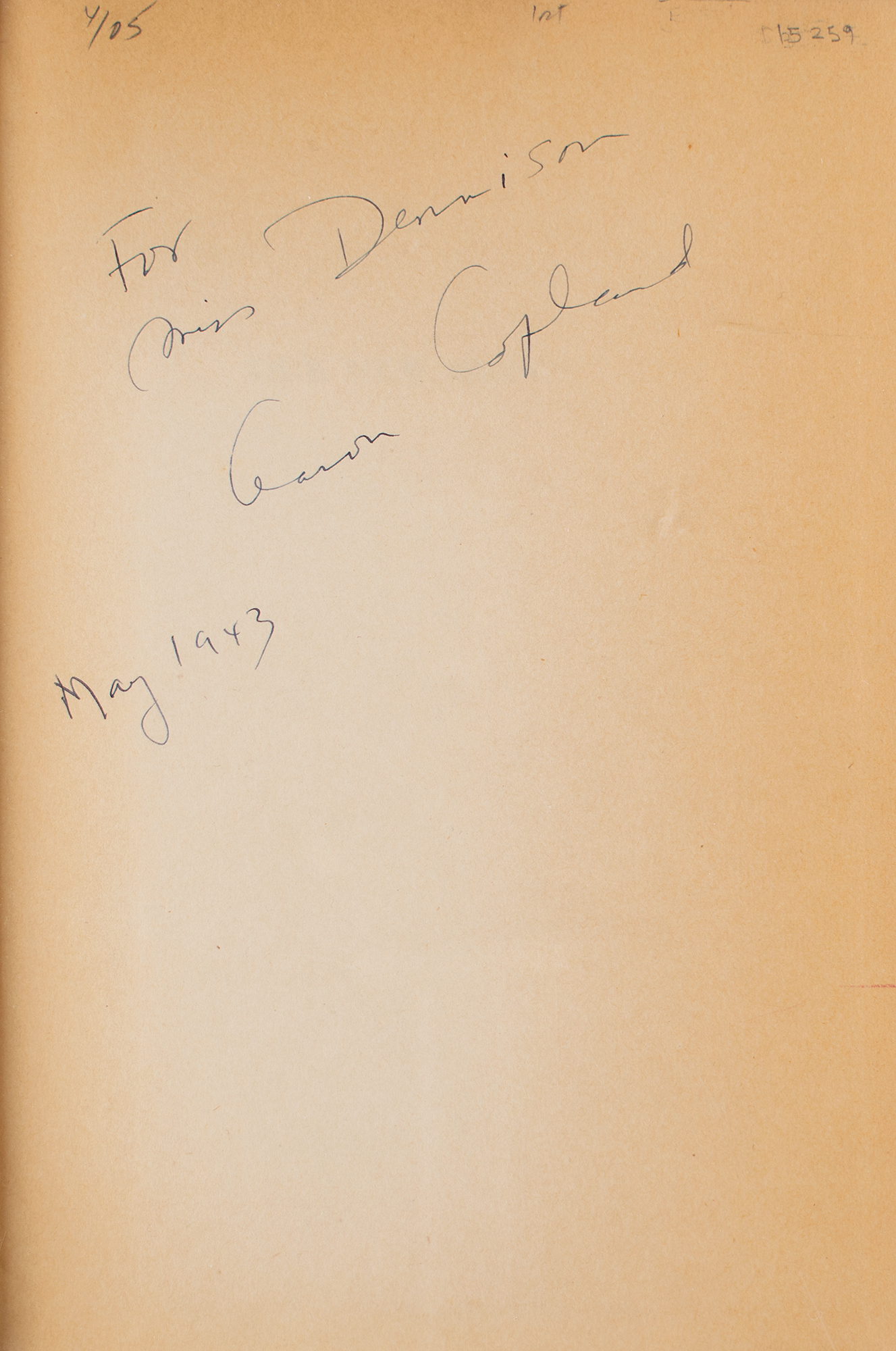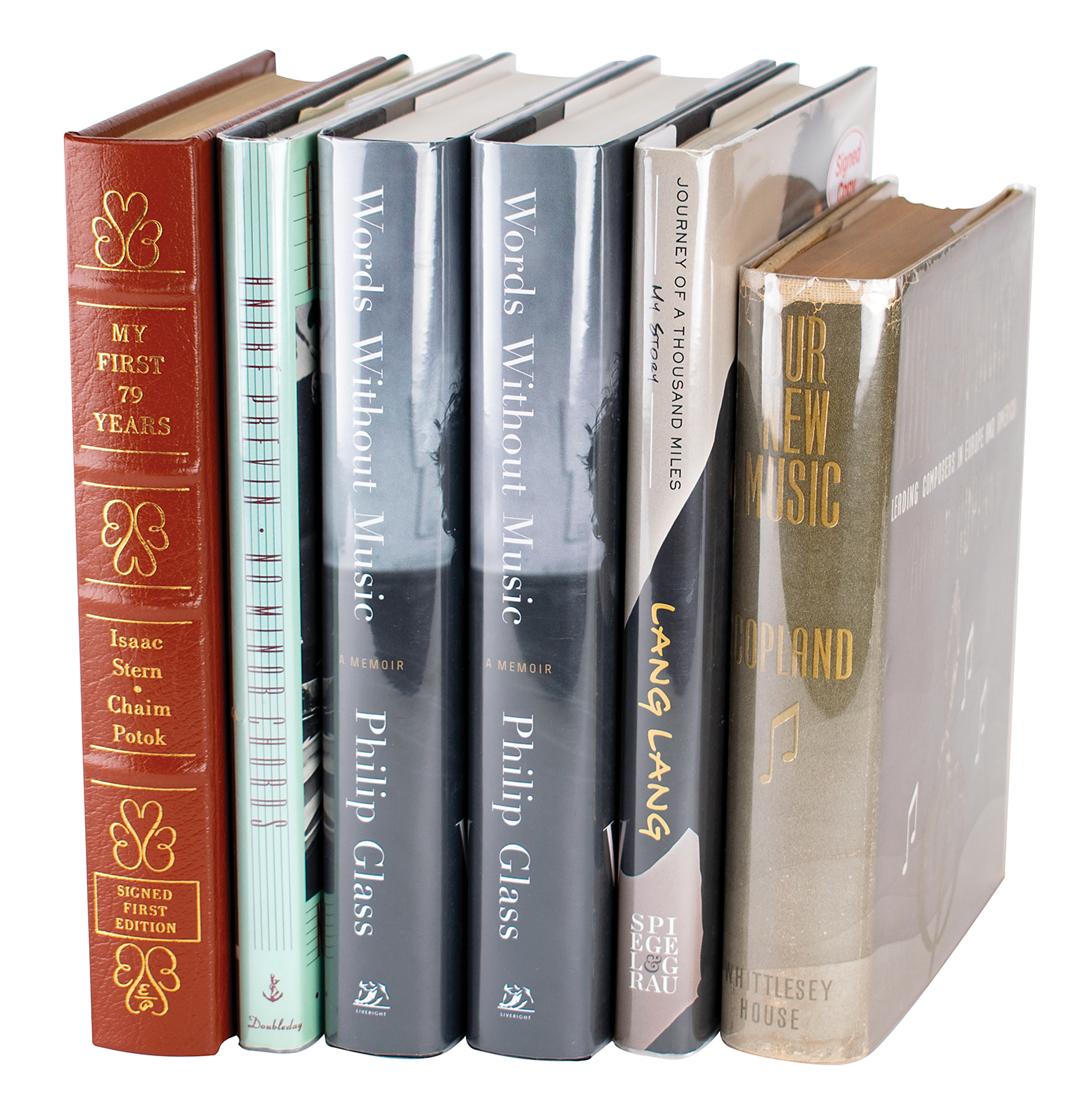 Six books signed by noted classical musicians and composers, including: Aaron Copland (Our New Music, inscribed); Isaac Stern (Easton Press edition of My First 79 Years, numbered 299/1075); Philip Glass (two copies of Words Without Music); Andre Previn (No Minor Chords); and Lang Lang (Journey of a Thousand Miles). In overall very good to fine condition, with toning to the signed Copland page.