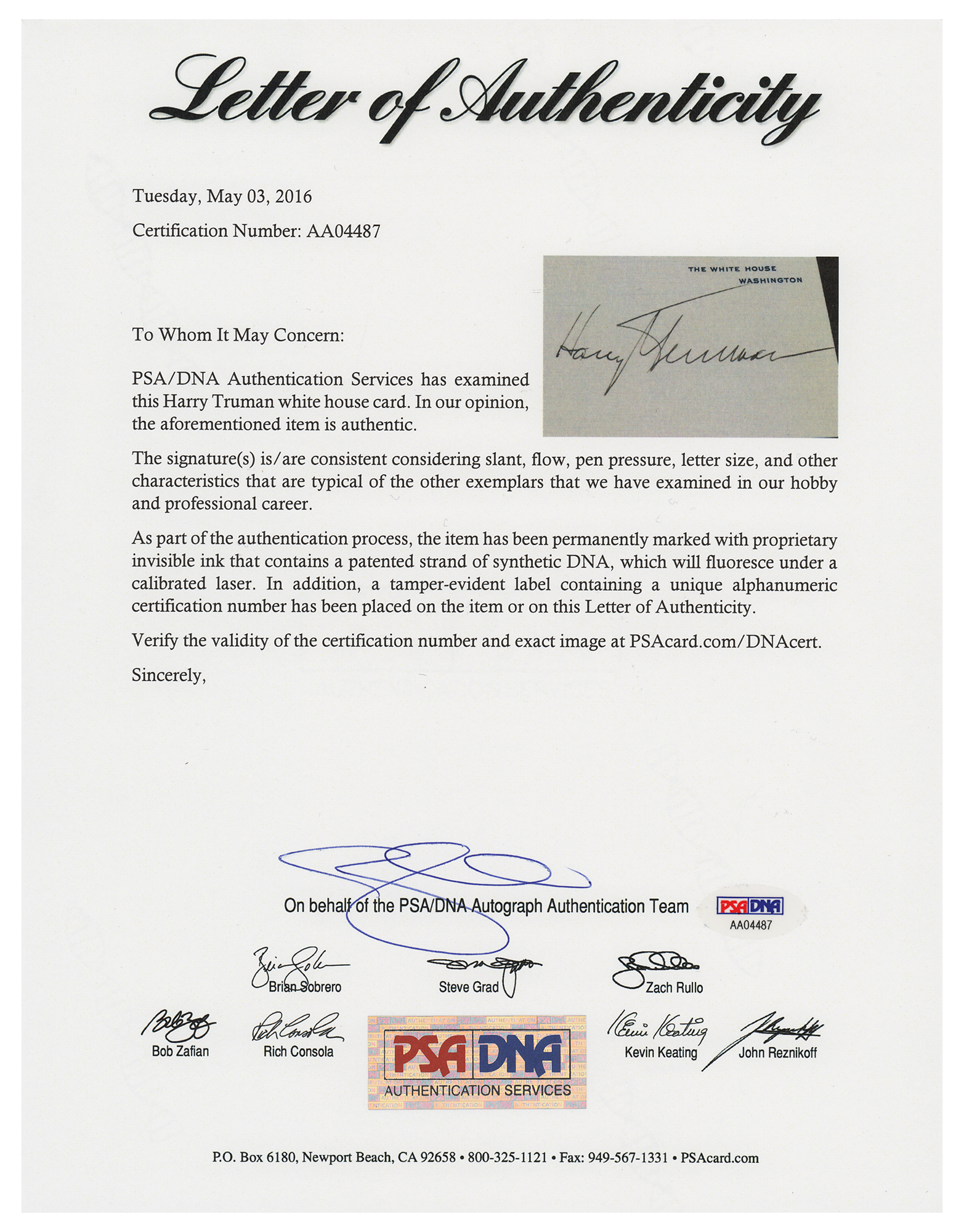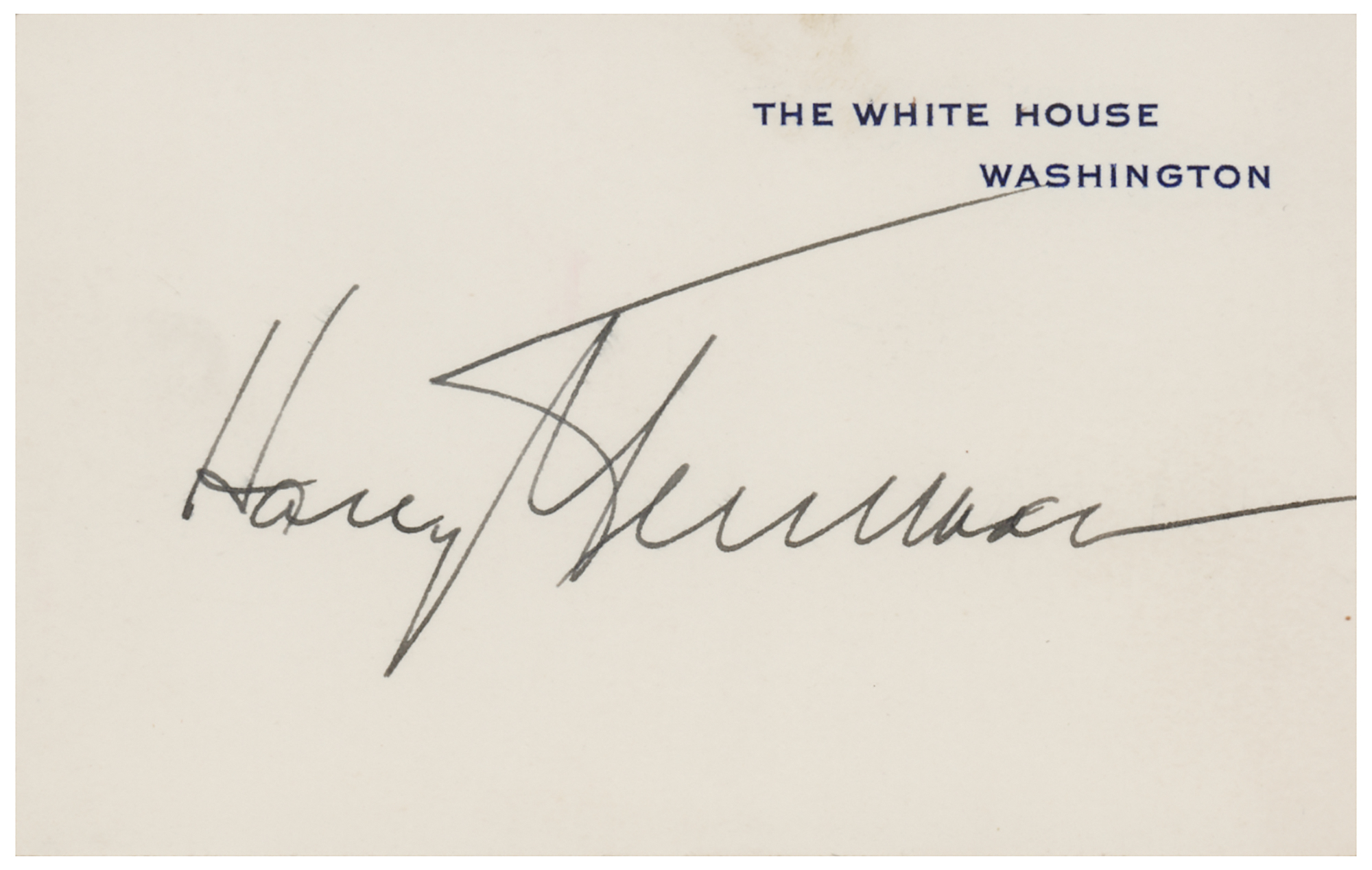 Official White House card, 4 x 2.5, signed neatly in fountain pen by President Harry S. Truman. In very fine condition. Accompanied by a full letter of authenticity from PSA/DNA.