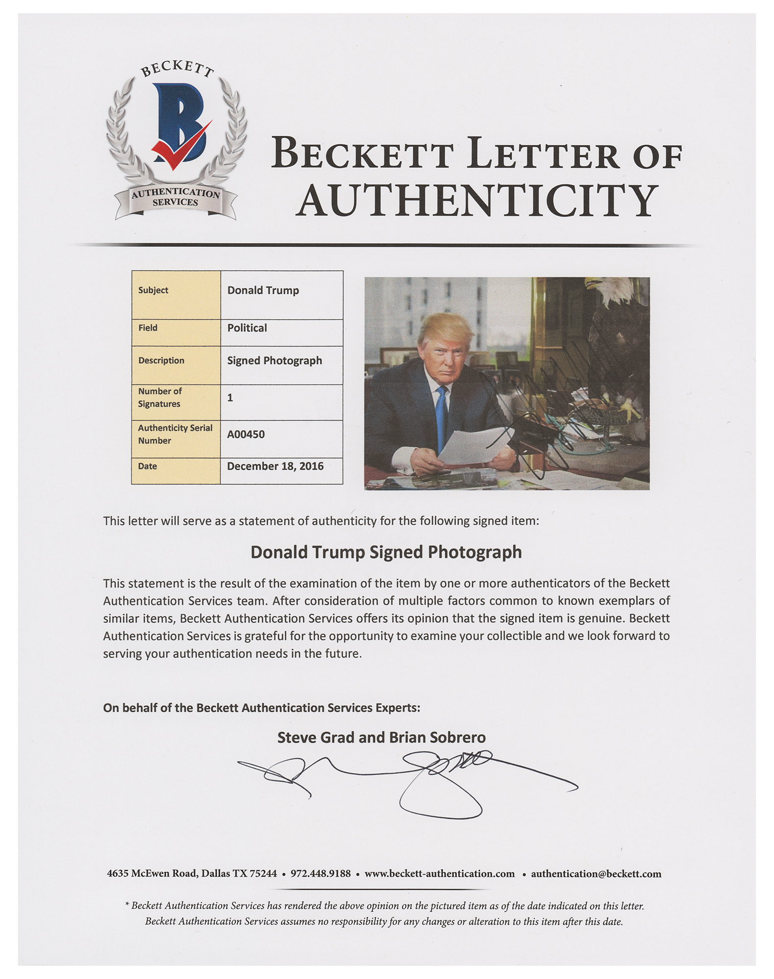 Amusing color satin-finish 11 x 8.5 photo of Donald Trump seated at his desk next to a bald eagle, signed in black felt tip. In very fine condition, with a Beckett label affixed to the lower left corner. Accompanied by a full letter of authenticity from Beckett Authentication Services.