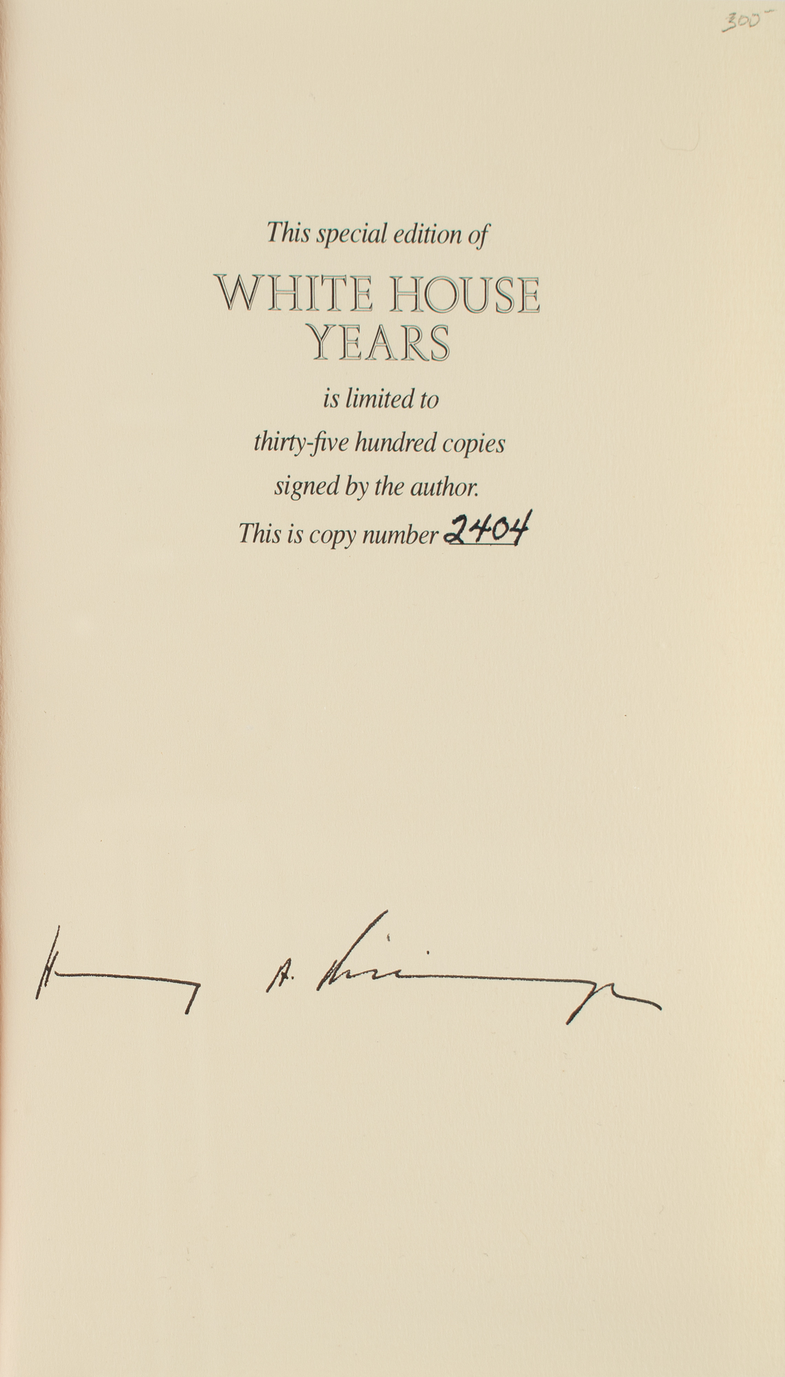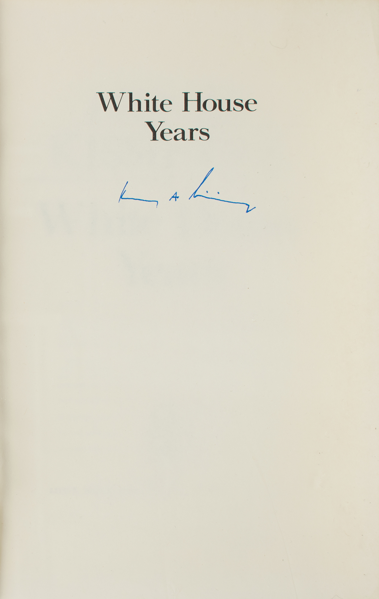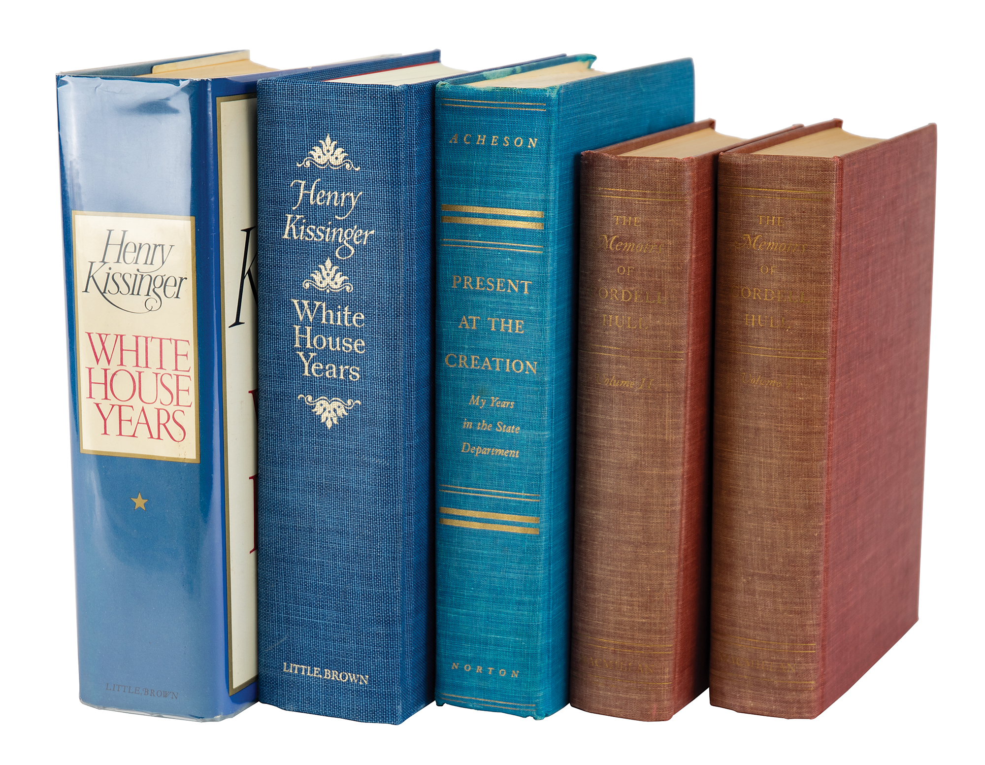 Four hardcover books signed by American Secretaries of State, including: Cordell Hull (The Memoirs of Cordell Hull, inscribed inside Vol. I); Dean Acheson (Present at the Creation: My Years in the State Department); and Henry Kissinger (two versions of White House Years: a trade edition and a limited edition, numbered 2404/3500). In overall very good to fine condition, with some minor foxing to the Acheson book.