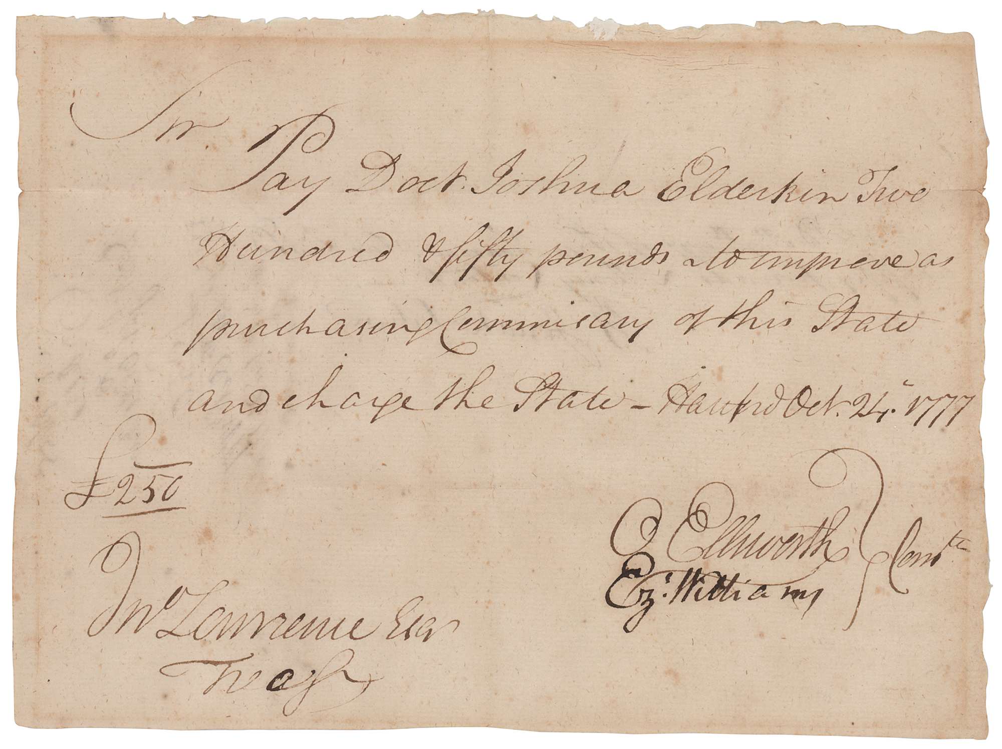 Third chief justice of the United States (1745-1807) and delegate to the Constitutional Congress who later submitted the amendments which became the Bill of Rights. Manuscript DS, signed “O. Ellsworth,” one page, 8.25 x 6.25, October 24, 1777. A pay order to Treasurer John Lawrence, in part: "Pay Doct. Joshua Elderkin Two Hundred & fifty pounds to improve as purchasing commissary of this State." Signed at the conclusion by Oliver Ellsworth and Ezekiel Williams as members of the Pay-Table Committee. In fine condition, with intersecting folds and light toning.