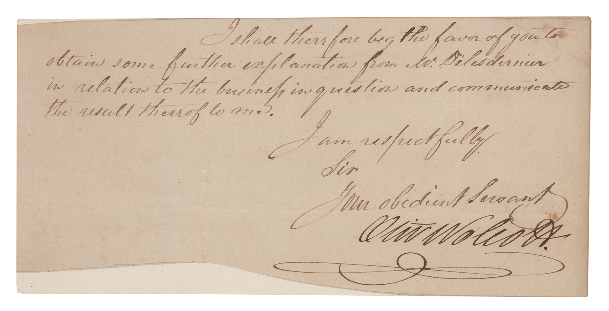American politician (1760-1833) who succeeded Alexander Hamilton as Secretary of the Treasury under Washington and Adams, and went on to serve as governor of Connecticut. LS signed “Oliv: Wolcott,” one page, 7.5 x 3.75, no date. Conclusion of a letter, in part: "I shall therefore beg the favor of you to obtain some further explanation from Mr. Delesdernier in relation to the business in question and communicate the result thereof to me." Backed by a slightly larger sheet. In fine condition.