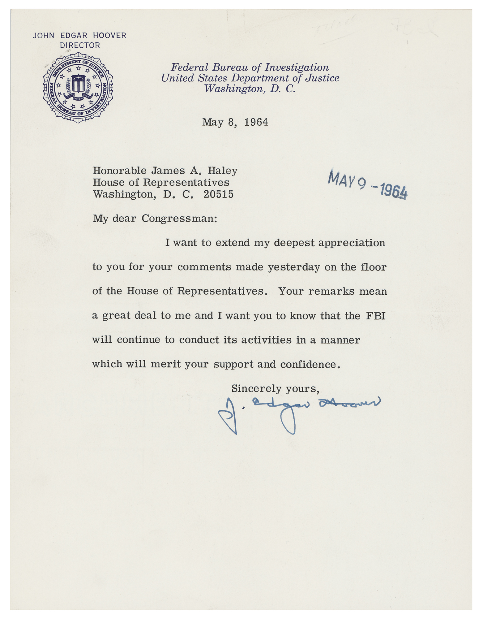 TLS, one page, 7.25 x 9.5, Federal Bureau of Investigation letterhead, May 8, 1964. Letter to Congressman James A. Haley, in full: "I want to extend my deepest appreciation to you for your comments made yesterday on the floor of the House of Representatives. Your remarks mean a great deal to me and I want you to know that the FBI will continue to conduct its activities in a manner which will merit your support and confidence." In fine condition.