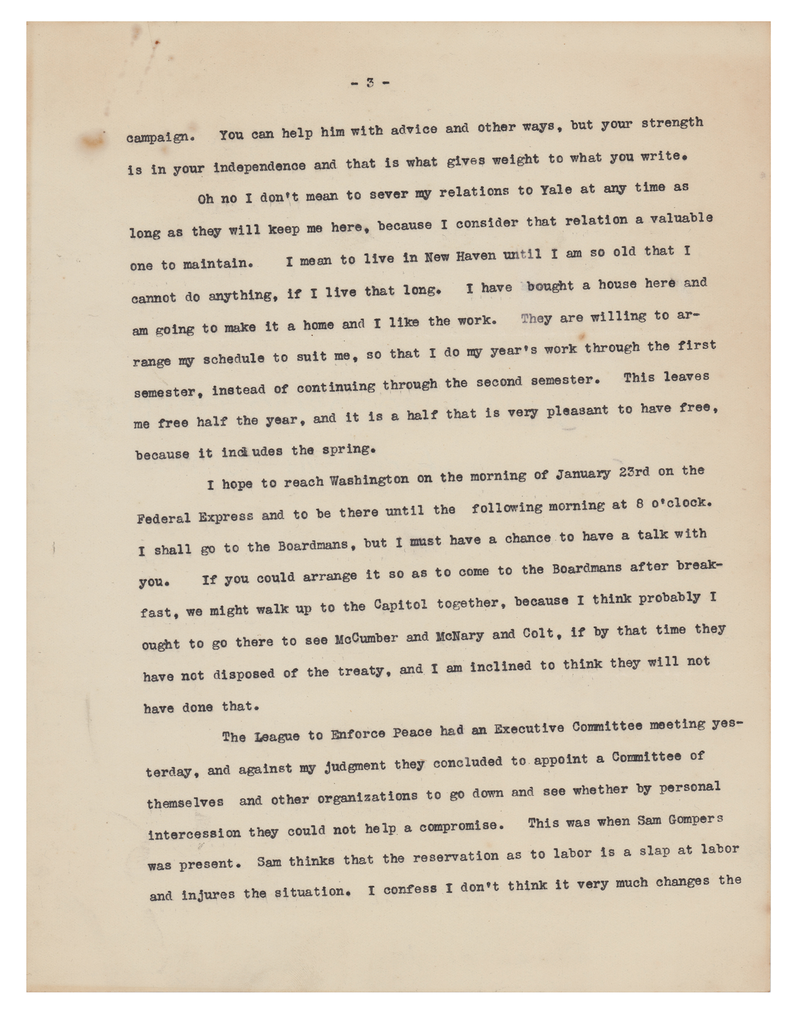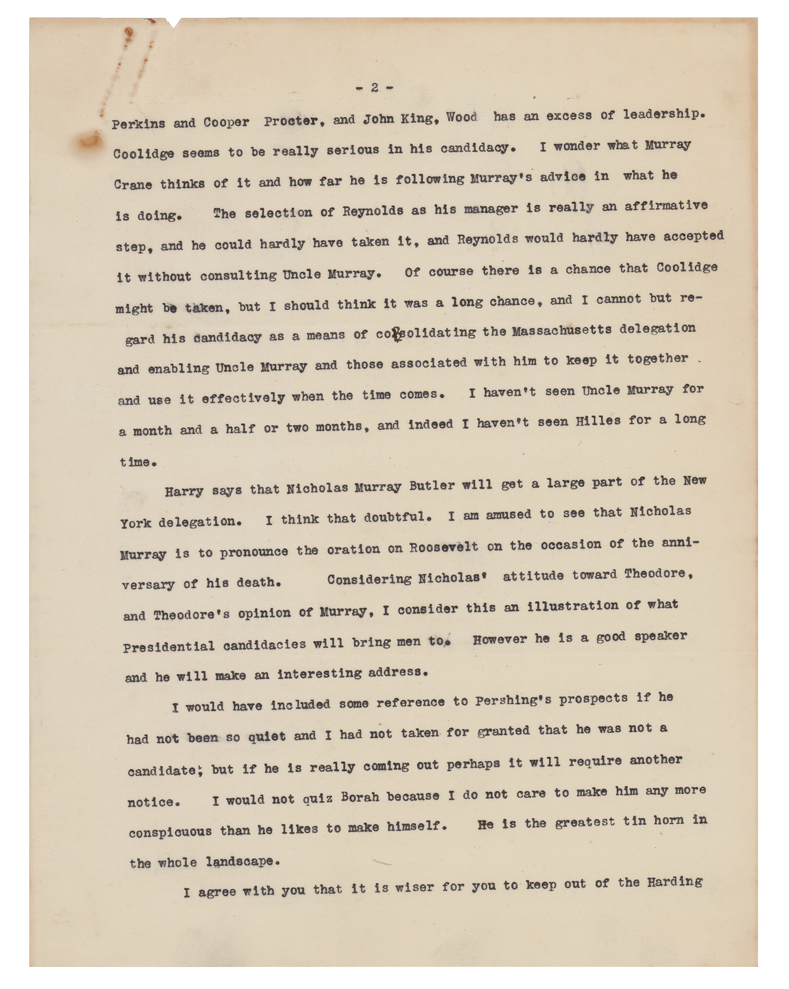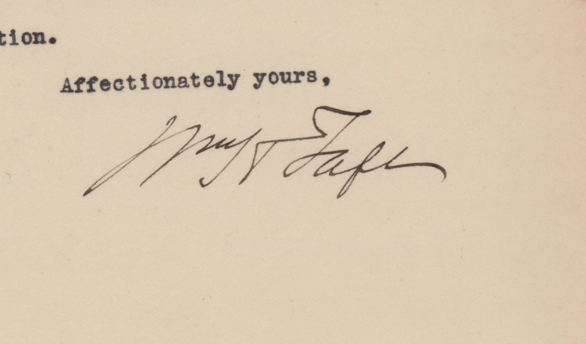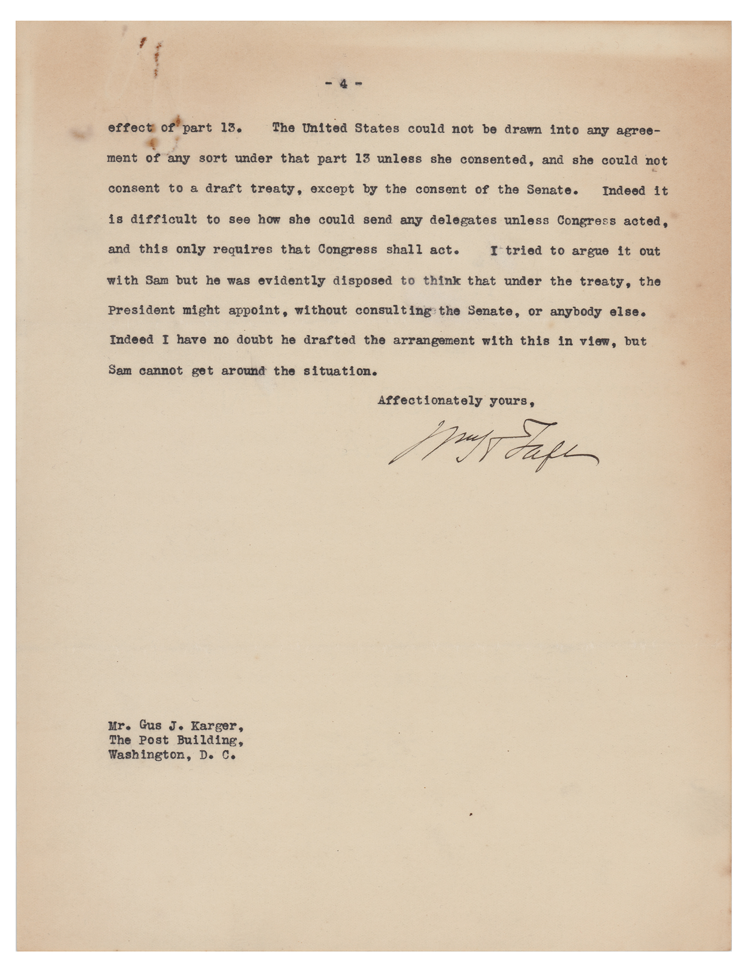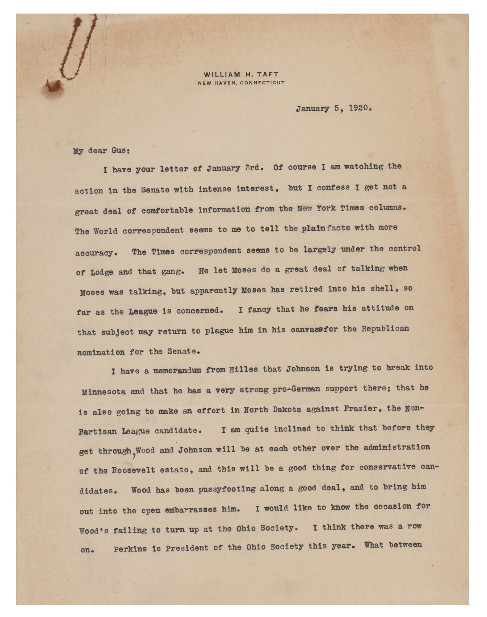 TLS signed "Wm. H. Taft," four pages, 8 x 10.5, personal letterhead, January 5, 1920. Letter to newspaper correspondent Gus J. Karger, discussing the Senate's evaluation of the League of Nations and the impending 1920 presidential election. In part: "Of course I am watching the action in the Senate with interest, but I confess I get not a great deal of information from the New York Times columns. The World correspondent seems to me to tell the plain facts with more accuracy. The Times correspondent seems to be largely under the control of Lodge and that gang?Coolidge seems to be really serious in his candidacy?I am amused to see that Nicholas Murray is to pronounce the oration on Roosevelt on the occasion of the anniversary of his death. Considering Nicholas' attitude toward Theodore, and Theodore's opinion of Murray, I consider this an illustration of what Presidential candidacies will bring men to?I agree with you that it is wiser for you to keep out of the Harding campaign. You can help him with advice and other ways, but your strength is in your independence and that is what gives weight to what you write." In very good to fine condition, with slightly irregular light toning, and rusty paperclip impressions to the top edge.