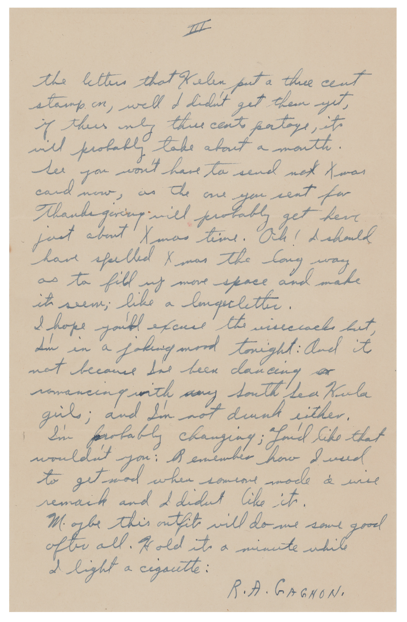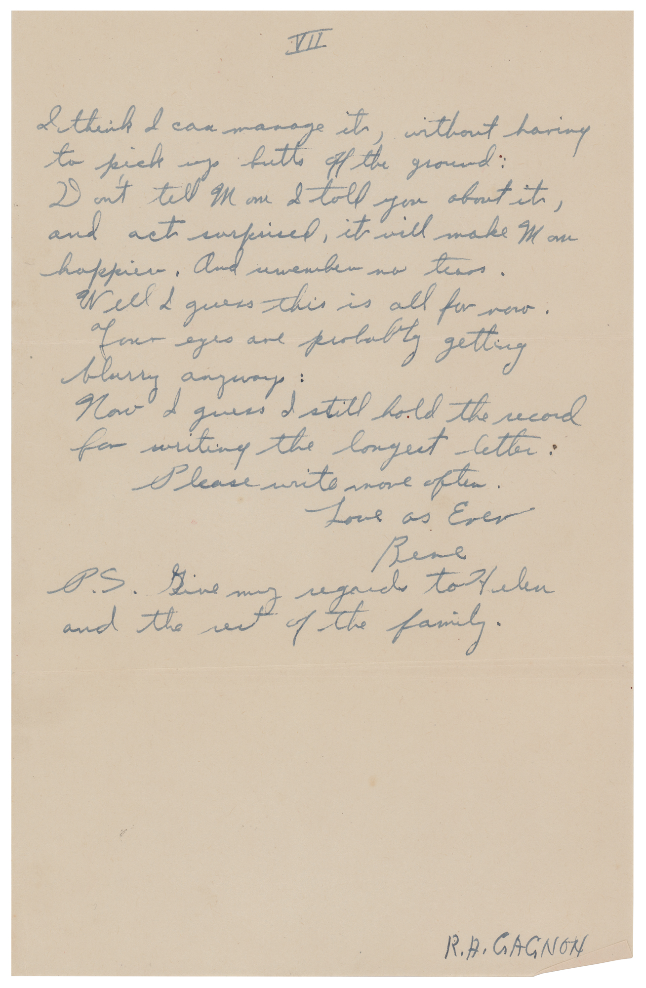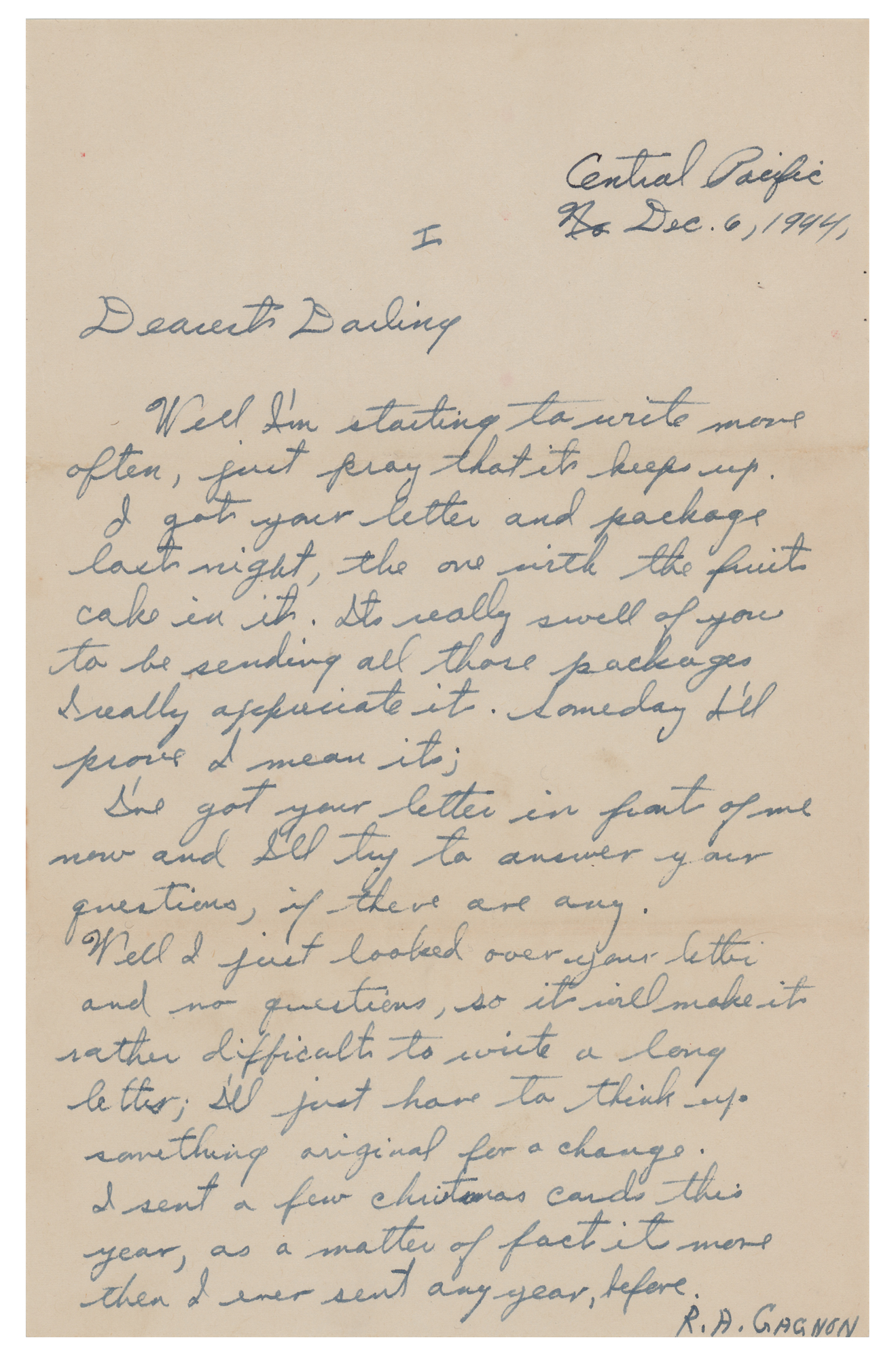 United States Marine Corps corporal (1925-1979) who participated in the Battle of Iwo Jima during World War II. He is generally (but incorrectly) remembered as one of the six flag-raisers who helped raise the second U.S. flag atop Mount Suribachi on February 23, 1945. World War II-dated ALS signed seven times, "R. A. Gagnon," and once, “Rene,” seven pages, 6.25 x 9.75, December 6, 1944. Handwritten letter to his future wife, Pauline Harnois, sent two months before the Battle of Iwo Jima from an undisclosed location in the "Central Pacific." In part: "I hope you'll excuse the wisecracks but, I'm in a joking mood tonight: And its not because I've been dancing or romancing with any South Sea Hula girls; and I'm not drunk either. I'm probably changing; You'd like that wouldn't you; Remember how I used to get mad when someone made a wise remark and I didn't like it. Maybe this outfit will do me some good after all. Hold it a minute while I light a cigarette?I started smoking Old Gold to get in good with [your father] then when I came home again he was smoking Lucky's so I switched again, to agree with him; now I see he's smoking Chesterfields; tell him if he doesn't stop changing his brand, I'm going to stop trying to keep up with him, and start smoking my pipe again?I'm sure we won't be back for at least a year and a half?Hopeless Chest?I hope you were just kidding; please don't give up hope, now after waiting two years, you must be able to wait at least a couple more." In fine condition. Accompanied by the original mailing envelope, addressed in Gagnon's hand and bearing another signature ("Pfc. R. A. Gagnon U.S.M.C.") in the return address area