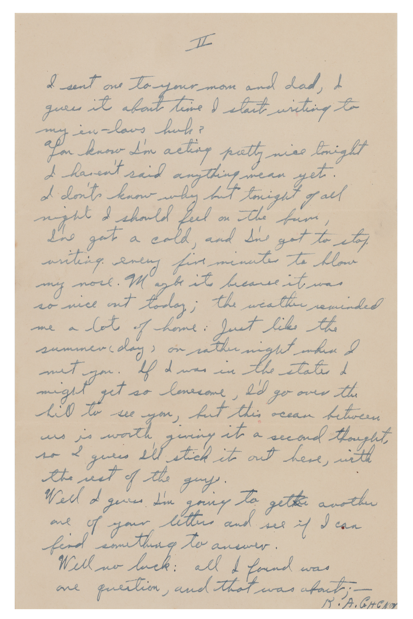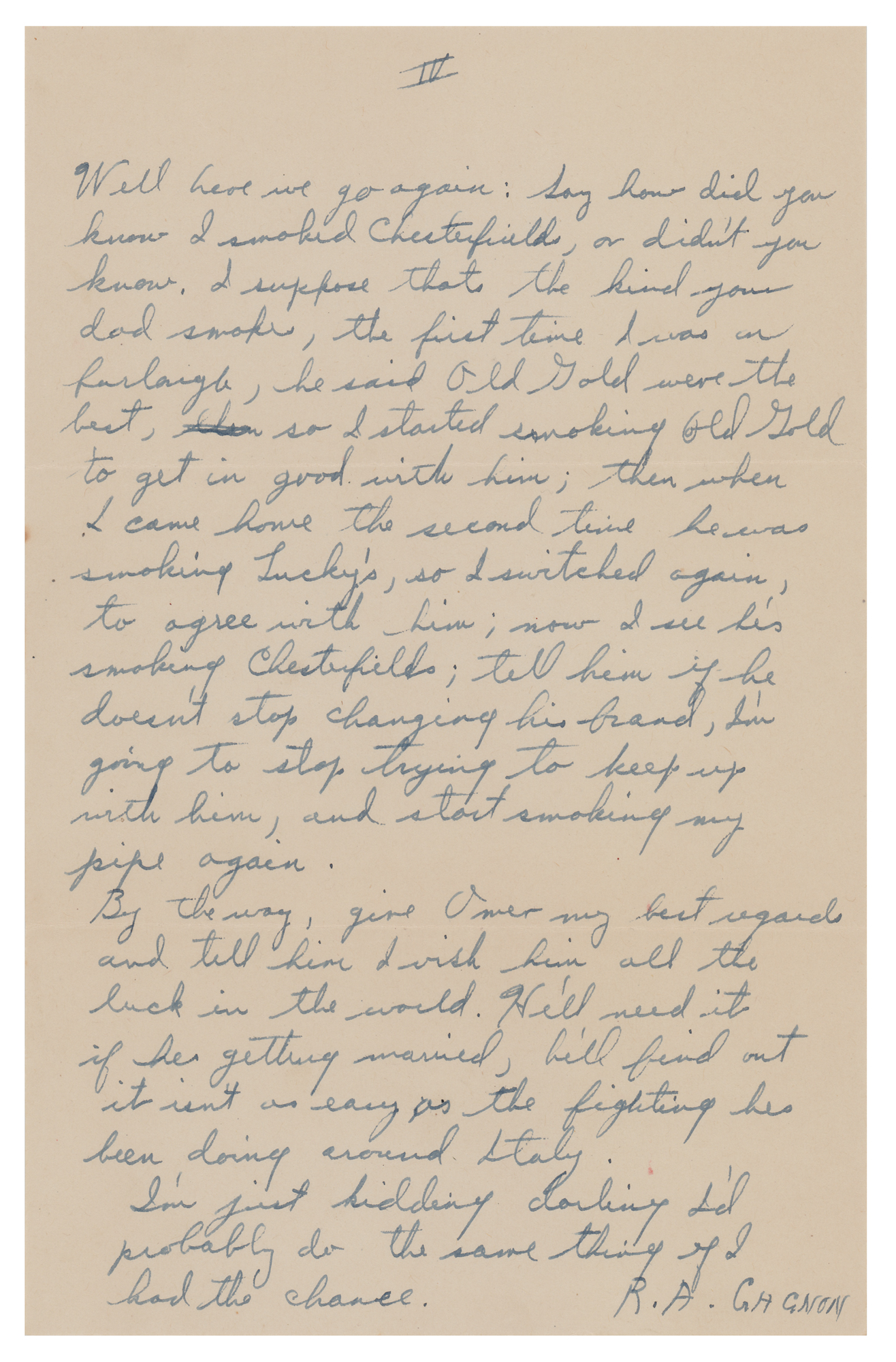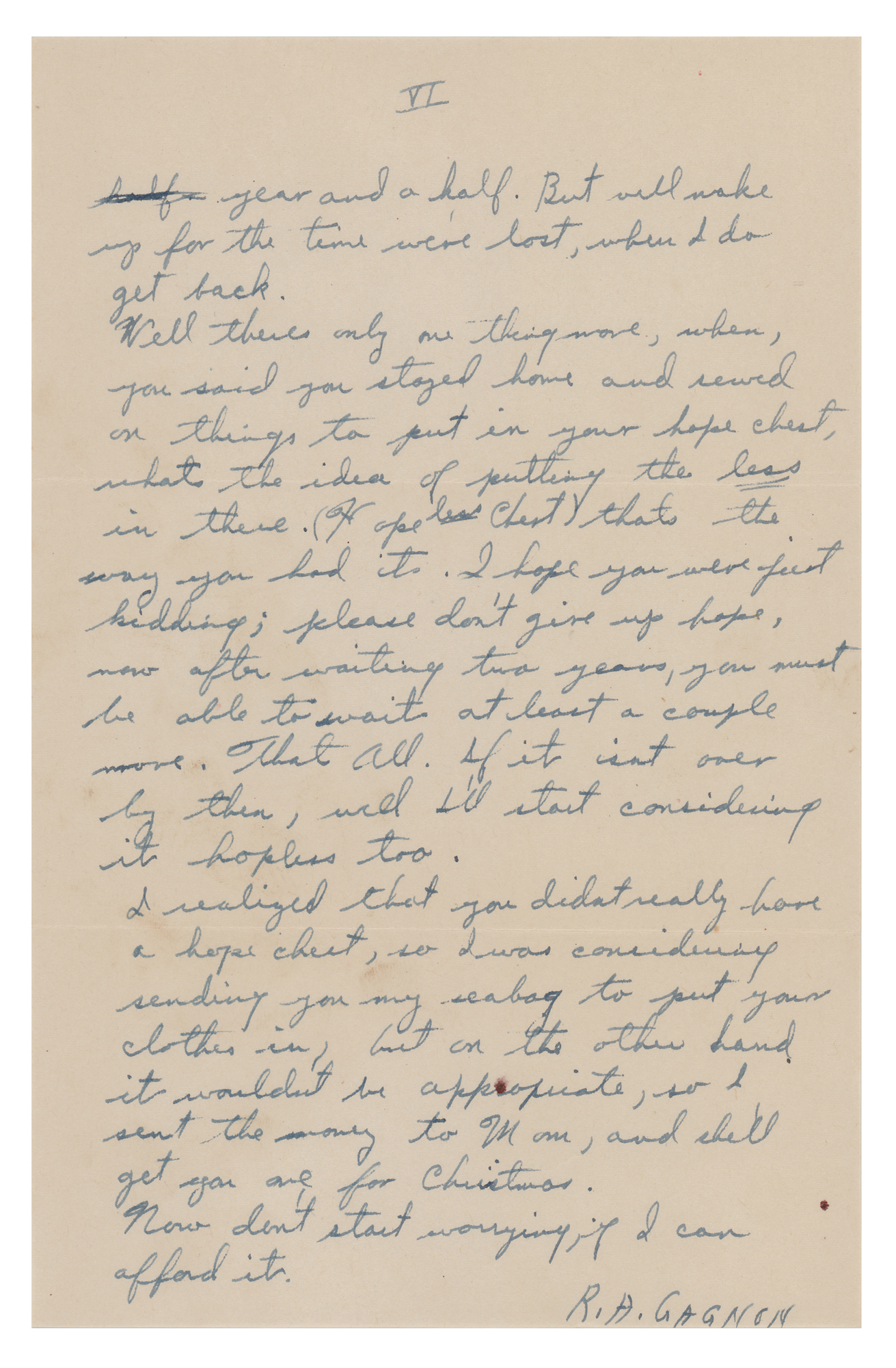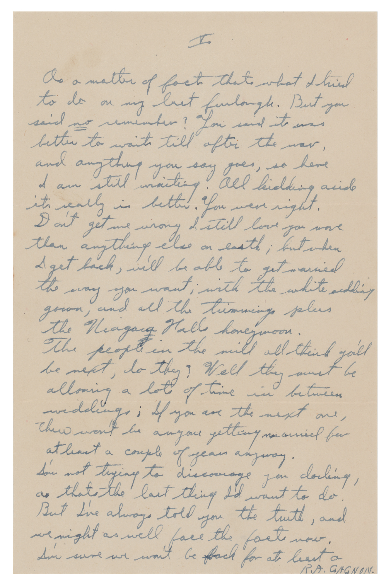 United States Marine Corps corporal (1925-1979) who participated in the Battle of Iwo Jima during World War II. He is generally (but incorrectly) remembered as one of the six flag-raisers who helped raise the second U.S. flag atop Mount Suribachi on February 23, 1945. World War II-dated ALS signed seven times, "R. A. Gagnon," and once, “Rene,” seven pages, 6.25 x 9.75, December 6, 1944. Handwritten letter to his future wife, Pauline Harnois, sent two months before the Battle of Iwo Jima from an undisclosed location in the "Central Pacific." In part: "I hope you'll excuse the wisecracks but, I'm in a joking mood tonight: And its not because I've been dancing or romancing with any South Sea Hula girls; and I'm not drunk either. I'm probably changing; You'd like that wouldn't you; Remember how I used to get mad when someone made a wise remark and I didn't like it. Maybe this outfit will do me some good after all. Hold it a minute while I light a cigarette?I started smoking Old Gold to get in good with [your father] then when I came home again he was smoking Lucky's so I switched again, to agree with him; now I see he's smoking Chesterfields; tell him if he doesn't stop changing his brand, I'm going to stop trying to keep up with him, and start smoking my pipe again?I'm sure we won't be back for at least a year and a half?Hopeless Chest?I hope you were just kidding; please don't give up hope, now after waiting two years, you must be able to wait at least a couple more." In fine condition. Accompanied by the original mailing envelope, addressed in Gagnon's hand and bearing another signature ("Pfc. R. A. Gagnon U.S.M.C.") in the return address area