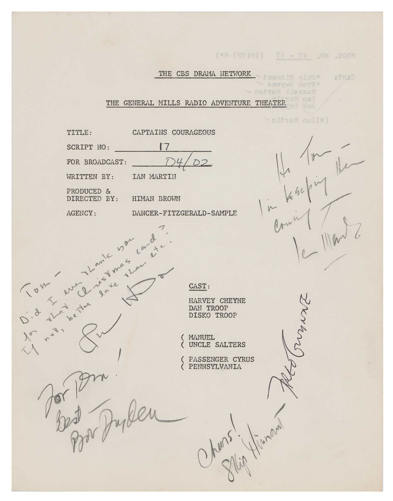 Title sheet for the script from the CBS Drama Network's General Mills Radio Adventure Theater episode 'Captains Courageous,' one page, 8.5 x 11, signed in bellpoint by Fred Gwynne, and in pencil by Skip Hinnant, Ian Martin, Bob Dryden, and Russell Horton, most of whom add inscriptions. In fine condition.