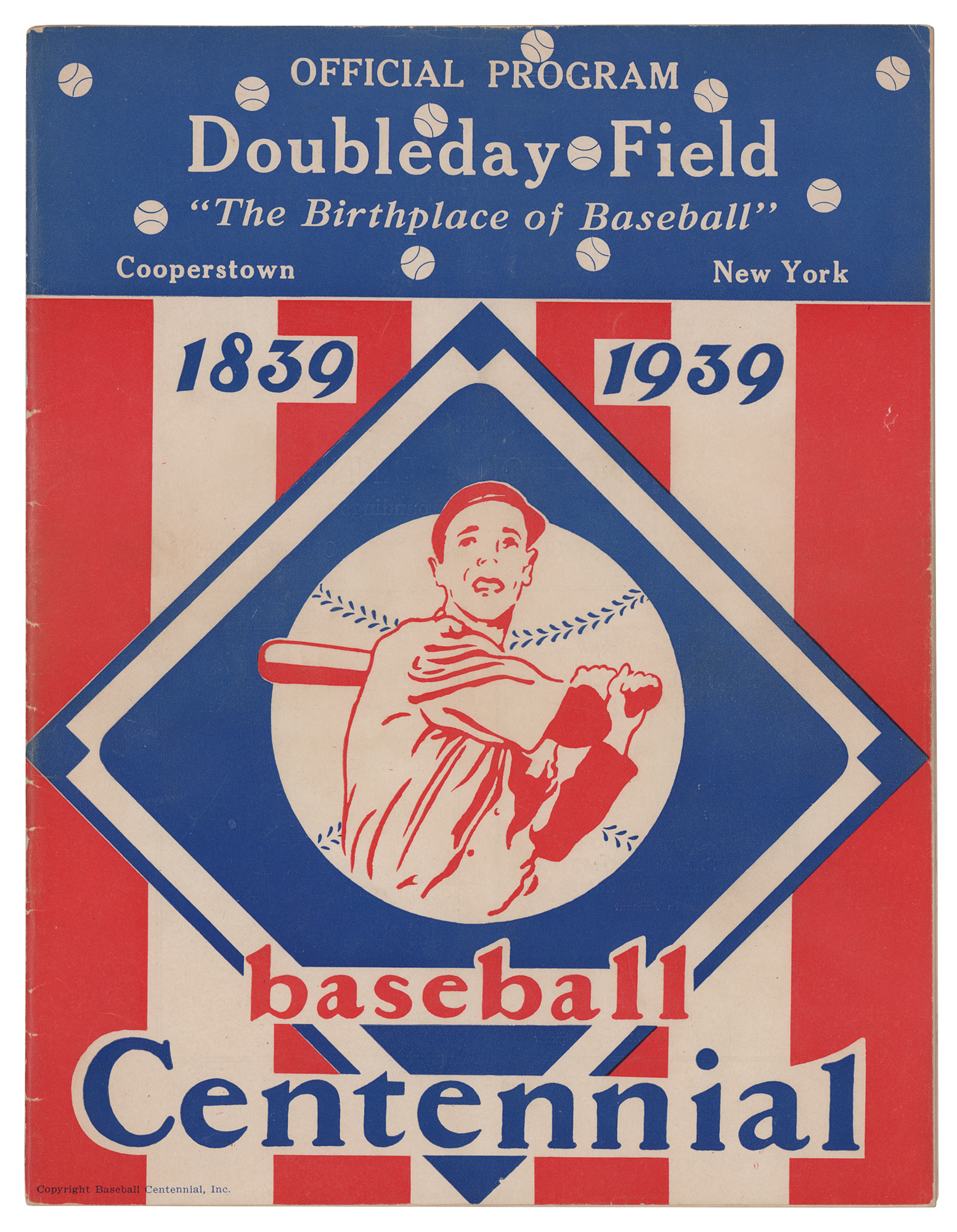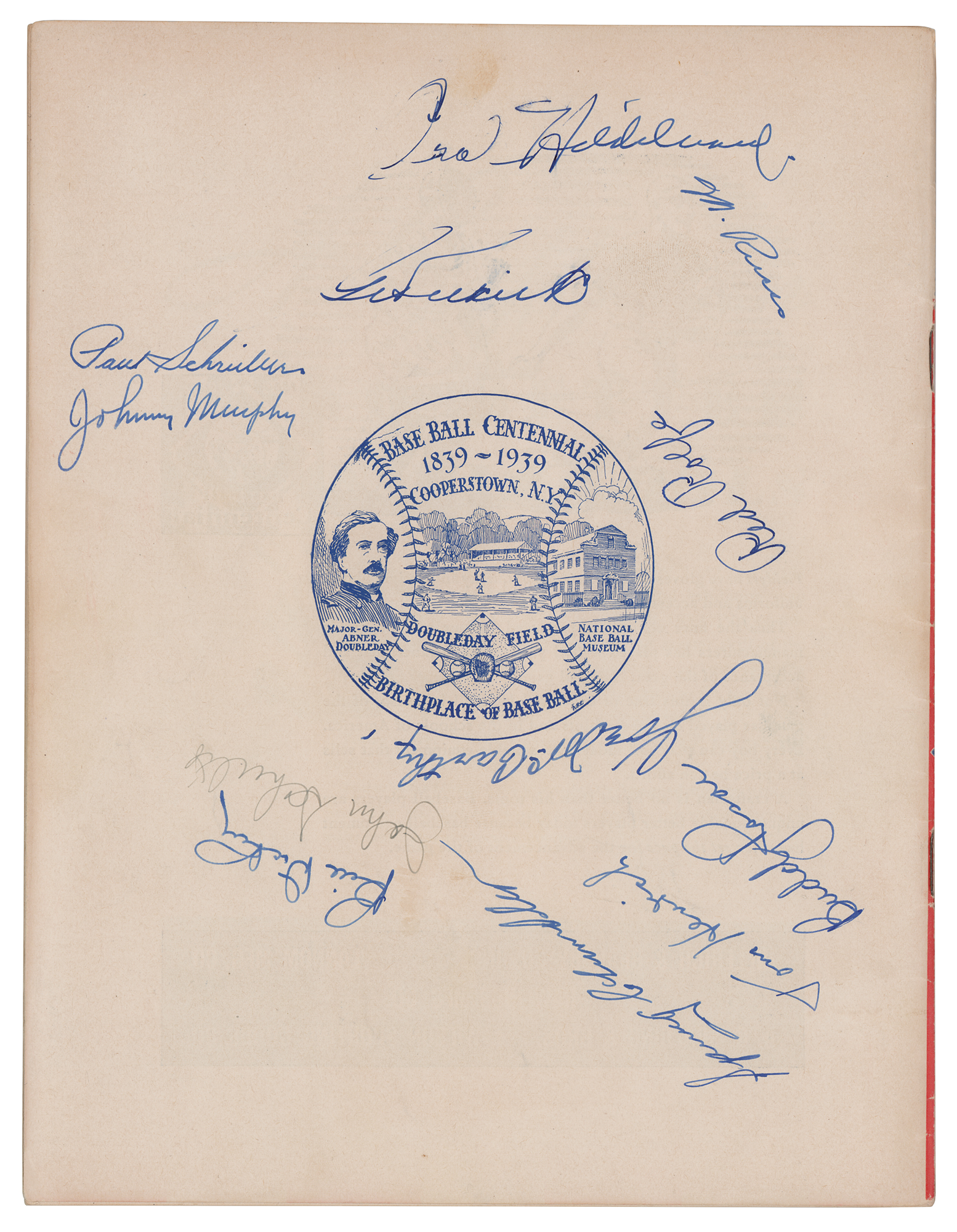 Program for a 1939 exhibition game between the New York Yankees and their Double-A affiliate, the Newark Bears, as part of festivities honoring baseball's centennial at Doubleday Field in Cooperstown, 8.5 x 11, signed on the back cover by Joe McCarthy, Bill Dickey, Spud Chandler, Tom Henrich, Buddy Rosar, Red Rolfe, Johnny Murphy, Oral Hildebrand, Marius Russo, George Selkirk, Johnny Schulte (pencil), and Paul Schreiber. In fine condition, with light handling wear, and a subtle central vertical bend.