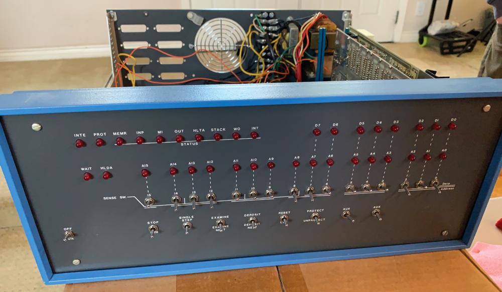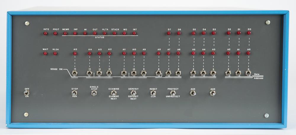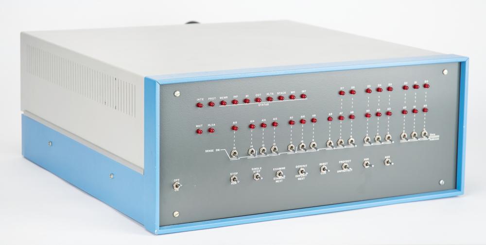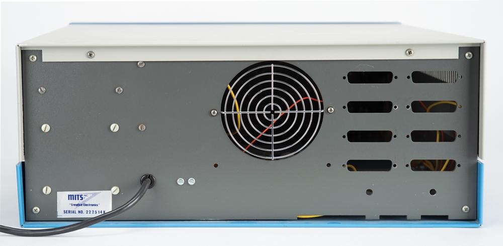 MITS Altair 8800 computer, serial no. 222514K, complete with its original white ceramic and gold Intel 8080 CPU (marked "C8080-8 / N6162"). The rear panel bears the affixed MITS, Inc. 'Creative Electronics' serial number label. Often credited with igniting the 'microcomputer revolution,' the Altair 8800 was the first commercially successful personal computer. Interest in it grew after it was featured on the cover of the 1975 issue of Popular Electronics, and it was sold by mail order as both a hobbyist kit and as a fully assembled unit. When Bill Gates and Paul Allen read about the Altair in Popular Electronics, they saw the opportunity to start their own computer software company and developed Altair BASIC—the very first product created by 'Micro-Soft.' Accompanied by two Altair user manuals.