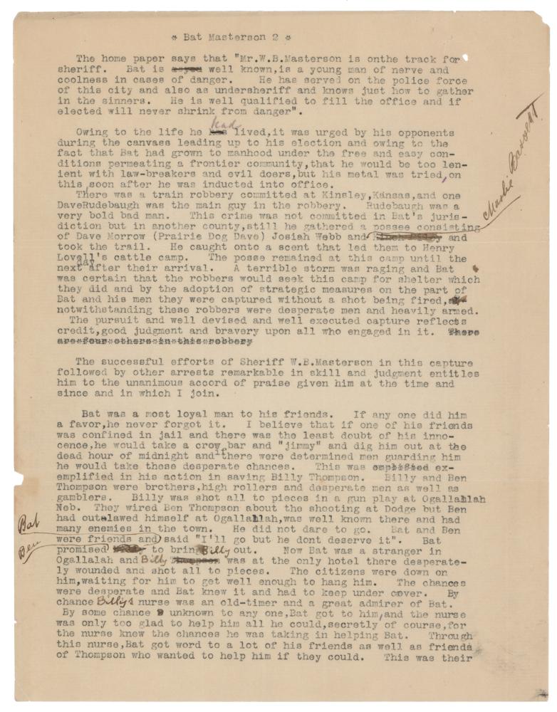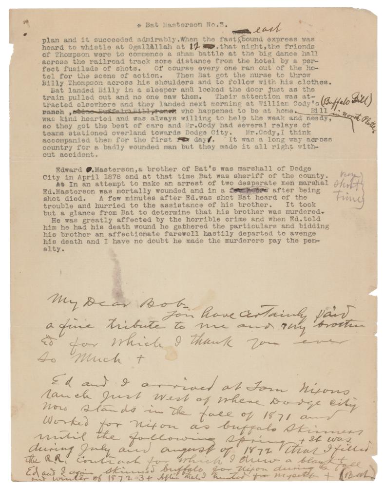ALS signed "Bat," written at the conclusion of a three-page typed biography of Masterson by Robert M. Wright, 8.5 x 11, no date but circa 1912. Wright intended to use the glowing bio—presenting incredible incidents from Masterson's career as a lawman, including the midnight rescue of an innocent man whisked away to 'Buffalo Bill' Cody's ranch, and the murder of Masterson's brother Ed in 1878—in his upcoming book, Dodge City, the Cowboy Capital. Wright concludes the biography with, "He [Bat] was greatly affected by the horrible crime and when Ed told him he had his death wound he gathered the particulars and bidding his brother an affectionate farewell hastily departed to avenge his death and I have no doubt he made the murderers pay the penalty." Masterson has made several corrections to the biography in his hand, including crossing out the name of Kinch Riley on page two, adding his name "Bat" into a text of conversation, writing "Charlie Bassett," and adding "(Buffalo Bill)" next to William Cody's name.