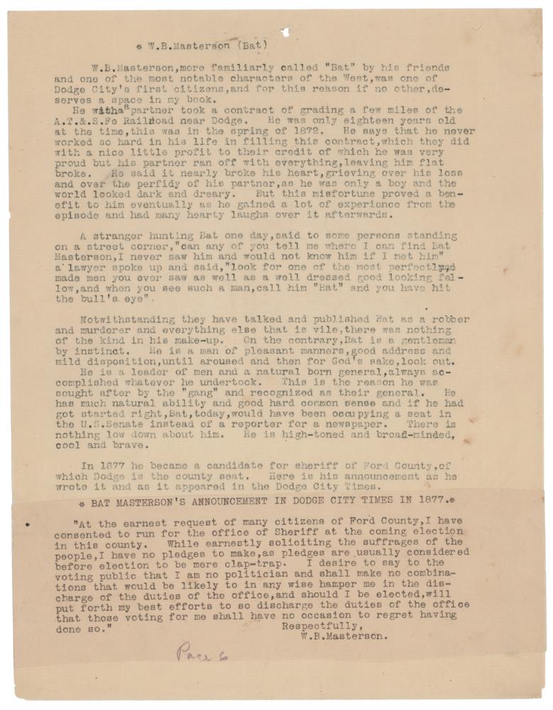 At the bottom of the third page, Masterson writes a letter to Wright: "My Dear Bob, You have certainly paid a fine tribute to me and my brother Ed for which I thank you ever so much. Ed and I arrived at Tom Nixon's ranch just west of where Dodge City now stands in the fall of 1871 and worked for Nixon as buffalo skinners until the following spring. It was during July and August of 1872 that I filled the R. R. contract for which I drew a blank & Ed and I again skinned buffalo for Nixon during the fall and winter of 1872-3. After that I hunted for myself. (Bat)." In fine condition, with small holes to the top edges, minor edge chipping, and a couple of light stains to the last page.