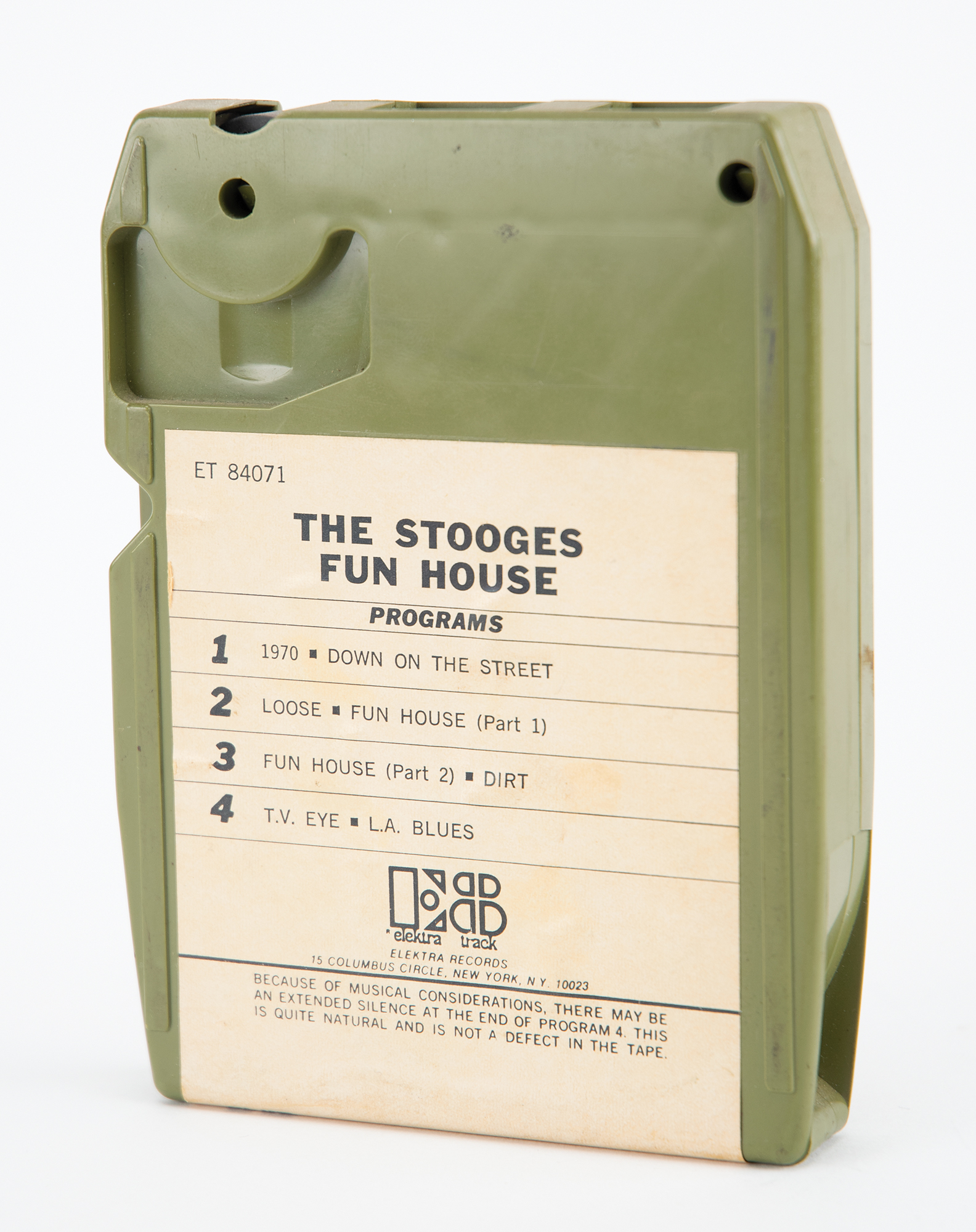 Elektra Records 8-track tape for Fun House, the second studio album by the Stooges. In fine cosmetic condition; working condition untested.
