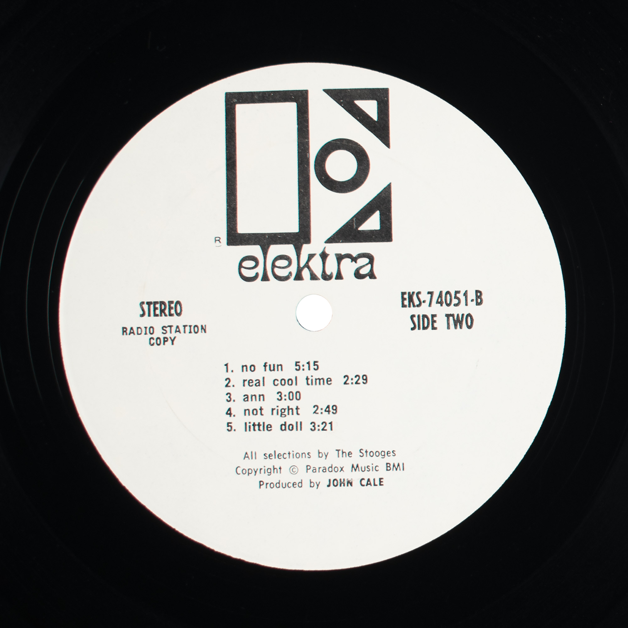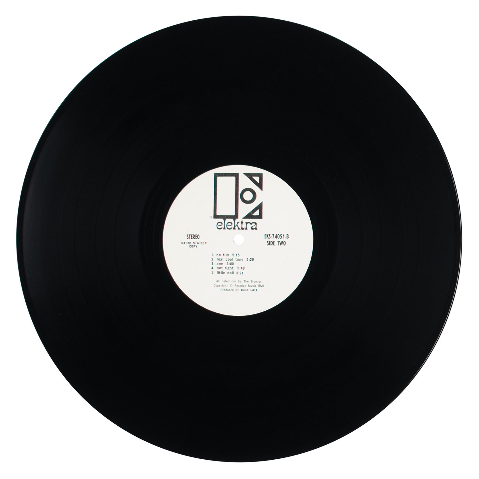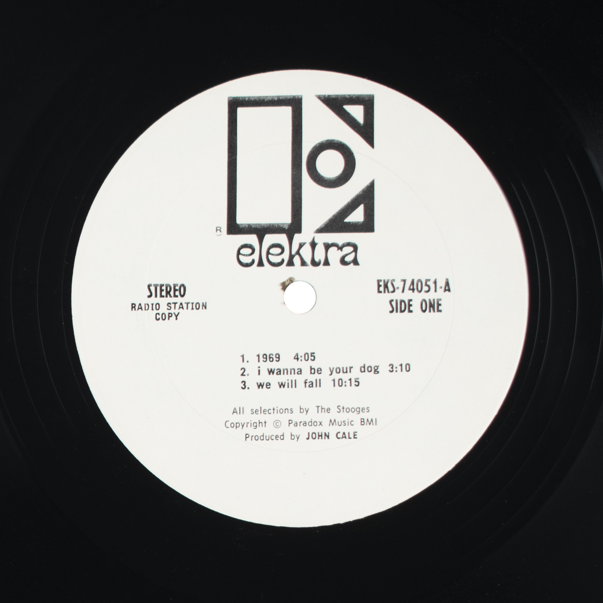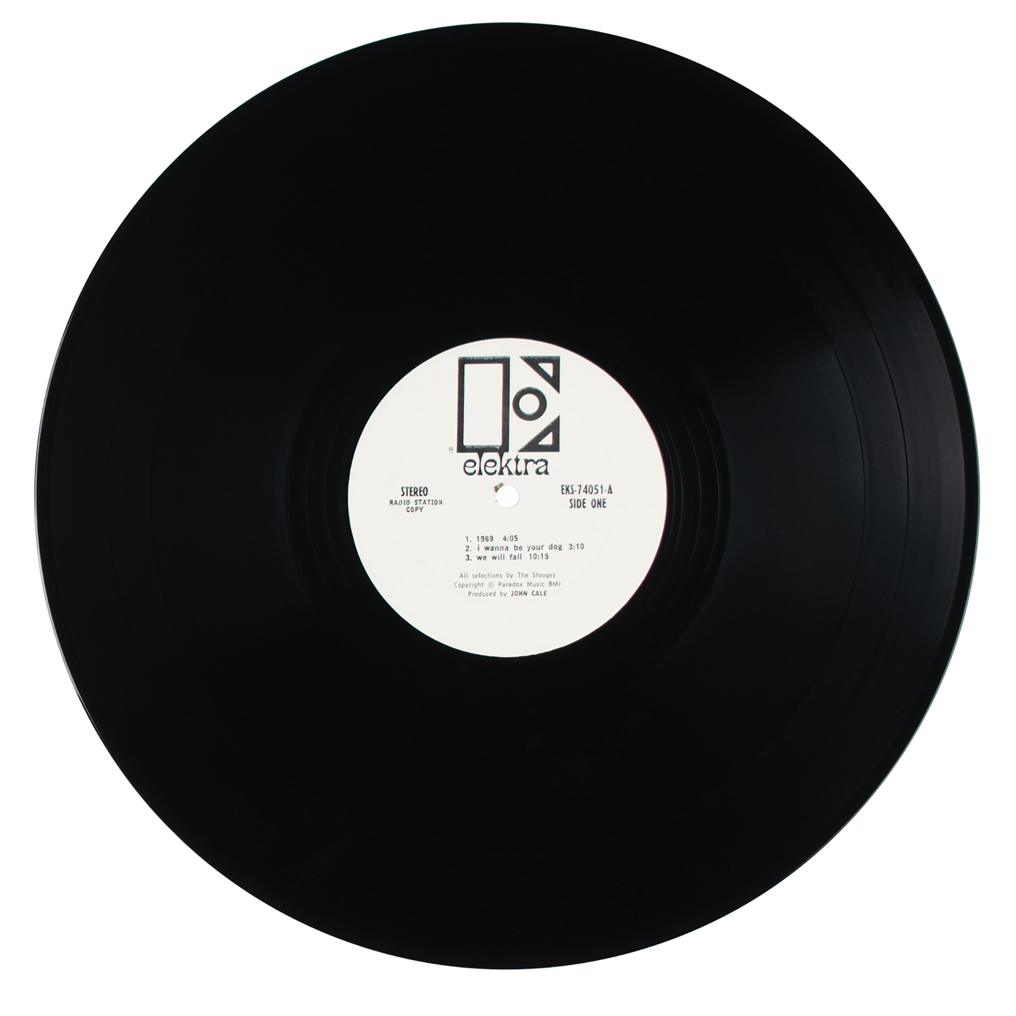 Uncommon Elektra Records promotional package for the 1969 self-titled debut by The Stooges, which contains: two glossy 8 x 10 photos of “Iggy Stooge” and the full band; a two-page background and biography dated to July 1969; a 45 RPM record for the band’s first single ‘I Wanna Be Your Dog,’ with both sides marked “For Radio Station Use Only”; and a stereo pressing (EKS-74051) of the band’s self-titled debut LP, with the front cover bearing an affixed “Promotional Copy, Not For Sale” label. Includes the original “The Stooges” promotional folder, and an Elektra Records color poster 19 x 26 poster for the debut album. In overall very good to fine condition, with light toning and soiling to the folder (partial separation to upper spine), folds (as issued) to poster, some creasing to bio and photos, and an area of surface loss to the single's label. The record is included.