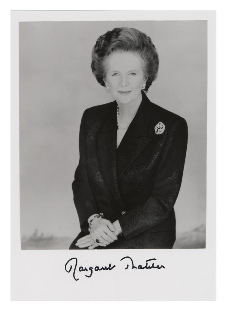 Satin-finish 5 x 7 half-length photo of Margaret Thatcher, signed in the lower border in black felt tip. In very fine condition.