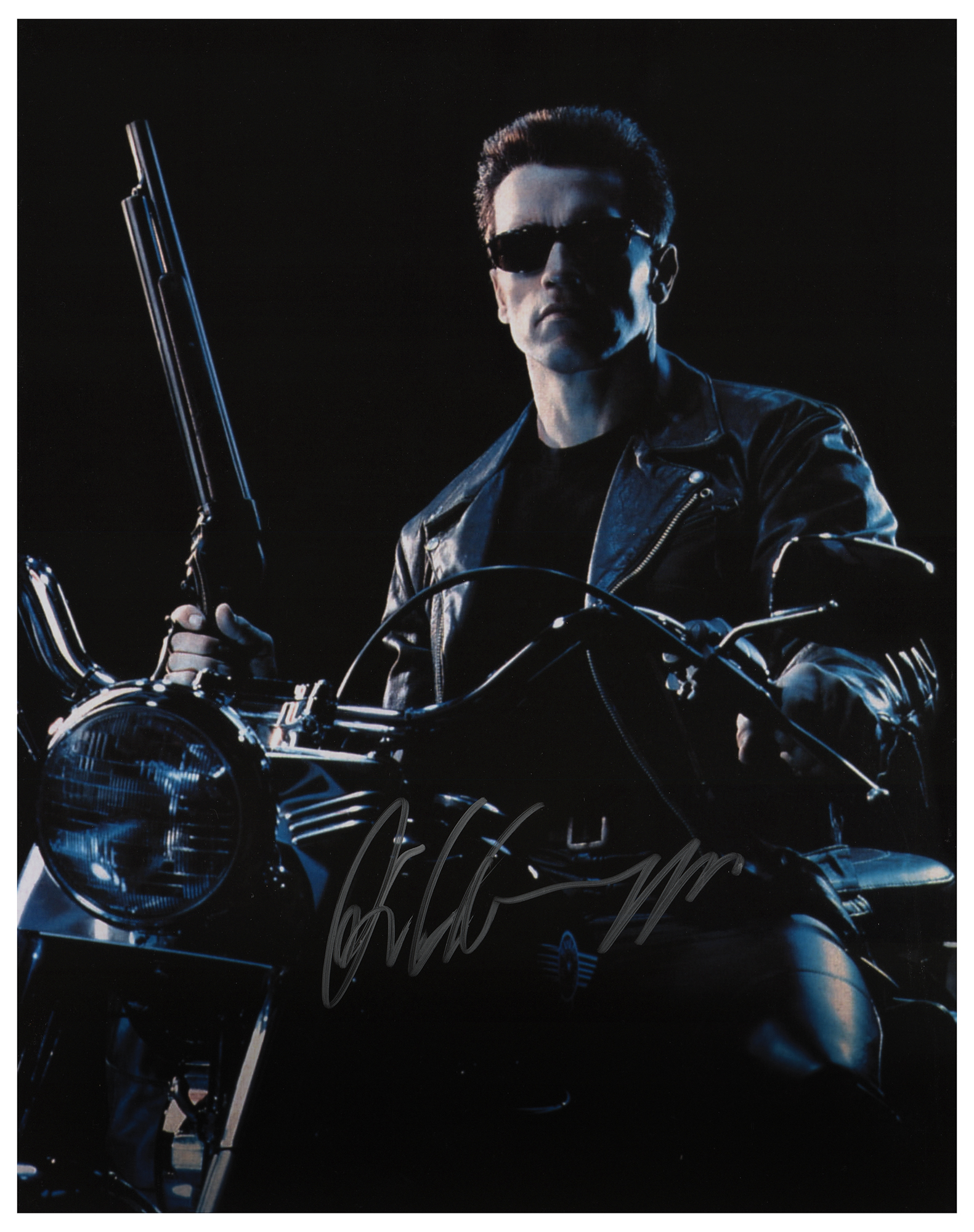 Color satin-finish 11 x 14 photo of Arnold Schwarzenegger from the Oscar-winning 1992 action film Terminator 2: Judgment Day, signed in silver ink. In fine condition.