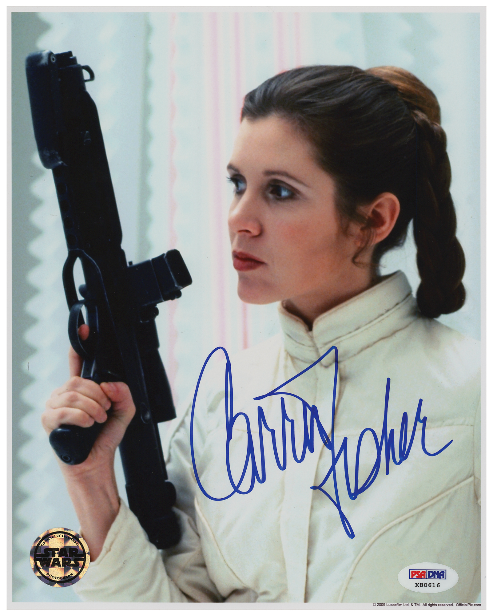 Color satin-finish 8 x 10 close-up photo of Princess Leia holding her blaster pistol, signed in blue felt tip. In very fine condition, with Official Star Wars and PSA/DNA labels affixed to the lower corners. Accompanied by a certificate of authenticity from PSA/DNA.
