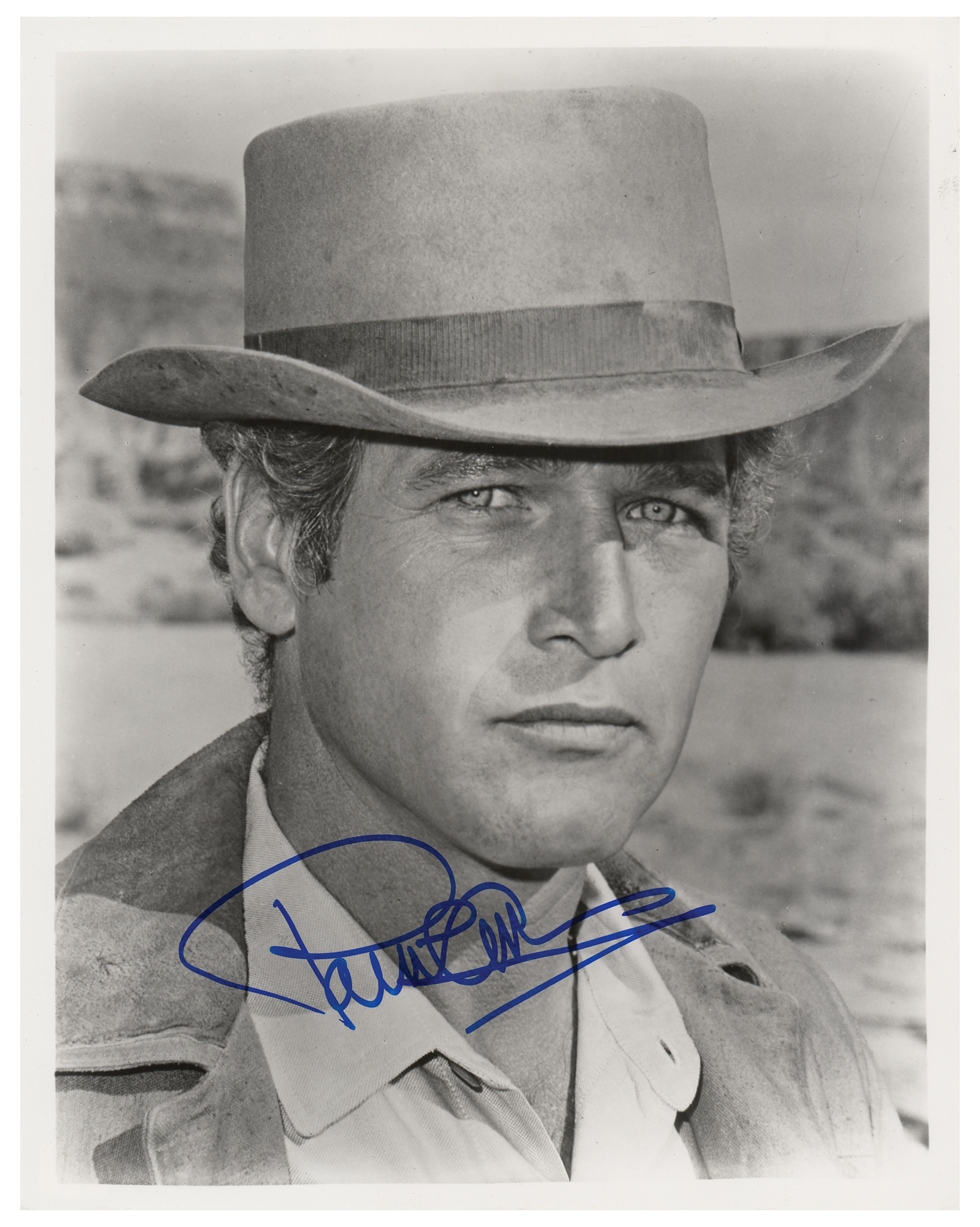 Glossy 8 x 10 close-up photo of Paul Newman as he appeared in the 1969 western Butch Cassidy and the Sundance Kid, signed in blue felt tip. In fine condition, with a small surface crease touching his left cheek.