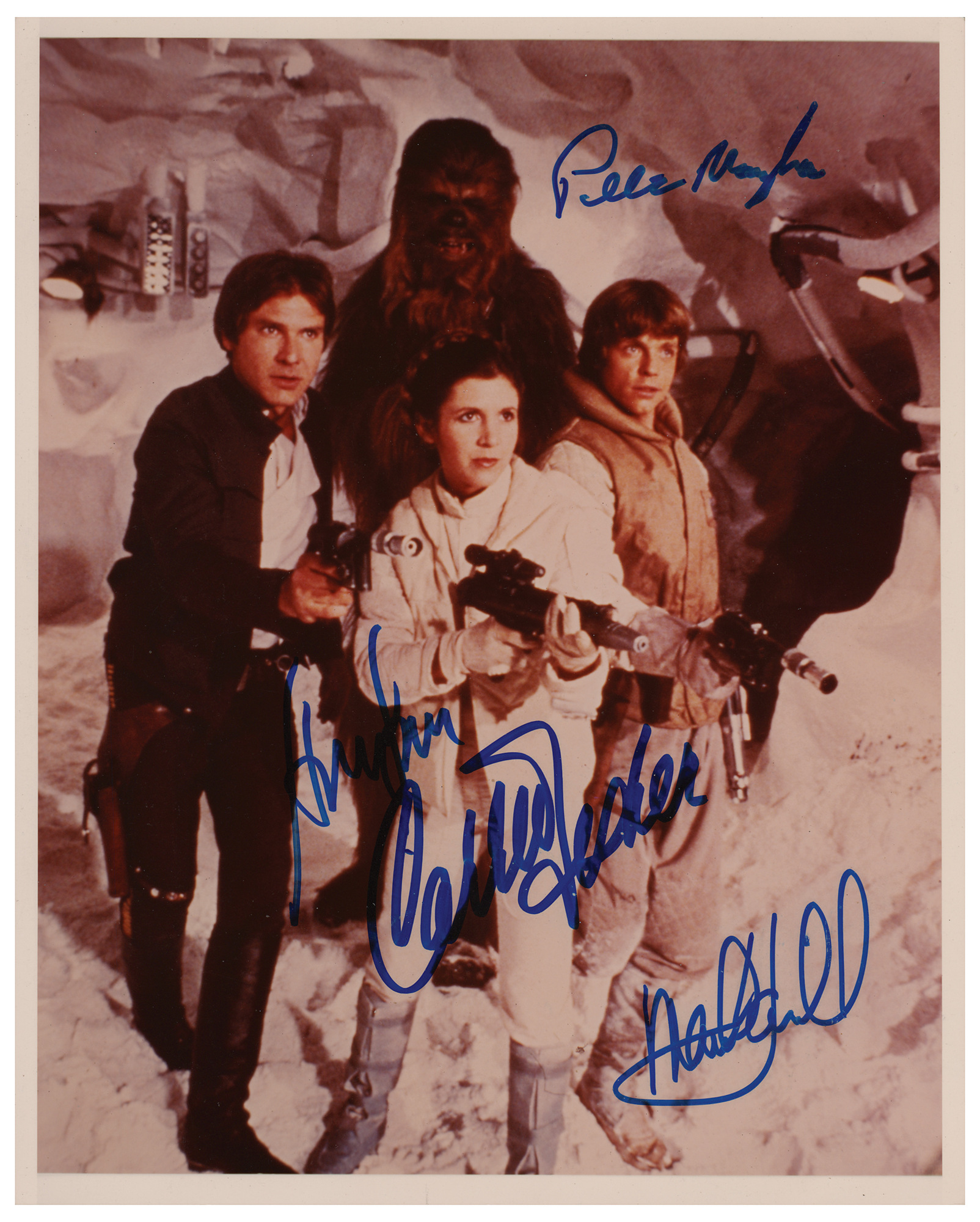 Sought-after color glossy 8 x 10 photo of Han Solo, Chewbacca, Princess Leia Organa, and Luke Skywalker from the classic Star Wars film The Empire Strikes Back, signed in blue felt tip by Harrison Ford, Carrie Fisher, Mark Hamill, and Peter Mayhew. In fine condition.