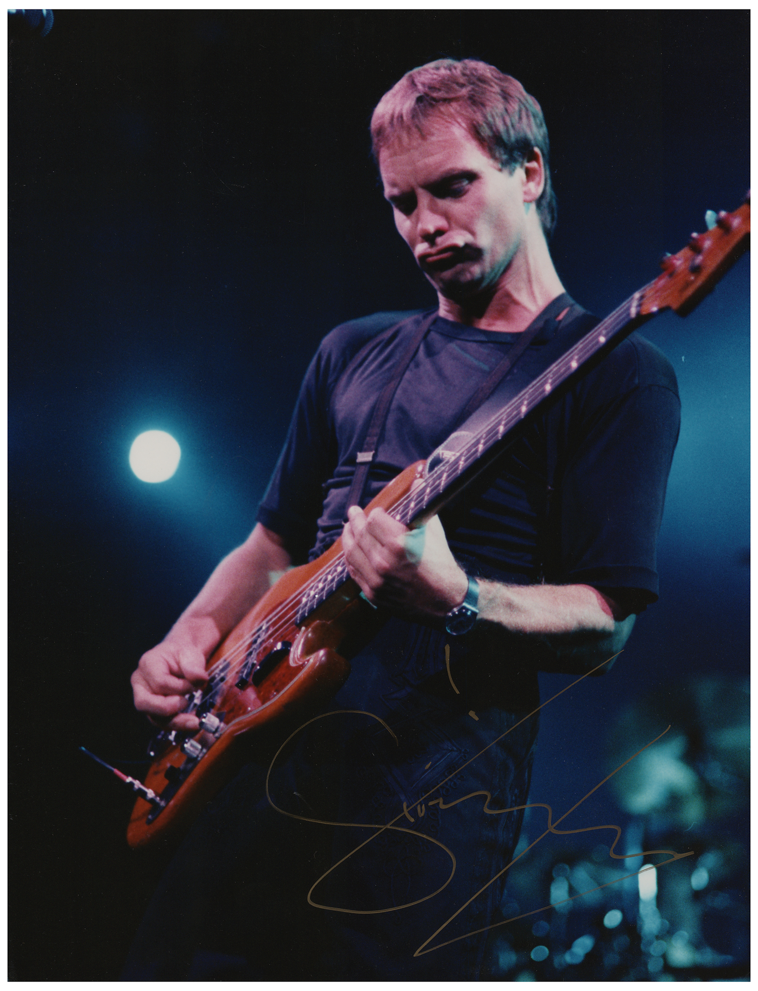 Color satin-finish 11 x 14 photo of Sting playing the bass during a live performance, signed in gold ink. In fine condition. Accompanied by an unused 'VIP' backstage pass for a Sting concert at the Hartford Civic Center in Hartford, Connecticut, on March 8, 1991, the date the autograph was obtained.