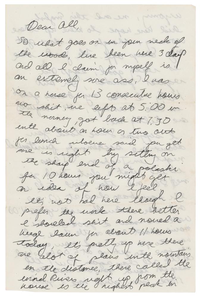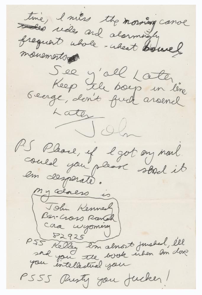 ALS signed “John,” three pages, 6 x 9, July 6, 1978. Handwritten letter from 17-year-old JFK, Jr., to his former counselors and fellow campers at the West Thumb Youth Conservation Corps, a high school work camp in Yellowstone National Park that he had briefly attended before his mother, former First Lady Jacqueline Kennedy, transferred him to Bar Cross Ranch in Cora, Wyoming, from where this letter is addressed. It reads, in full: “Dear all, So what goes on in your neck of the woods, I’ve been here 3 days and all I can claim for myself is an extremely sore ass. I was on a horse for 13 consecutive hours, no shit, we left at 5:00 in the morning, got back at 7:30 until about an hour or two out for lunch, whoever said you get sore is right, try sitting on the sharp end of a polaski for 10 hours you might get an idea of how I feel. It’s not bad here though. I prefer the work there better, I shoveled shit and mowed a huge lawn for about 11 hours today. It’s pretty up here, there are a lot of plains in the mountains in the distance, there called the Wind Rivers, right up from the house is the highest peak in Wyoming, me and this English kid here hope to hike up there someday, though we don’t get any days off. The food here is really good, eggs and regular pancakes, oh but Katy I miss my brewers yeast in the mornings, the mosquitos are killing me. I suppose Steve told you about one sickeningly puritanical night in Jackson. Jesus, Will what a dirty trick, give me $80 and then don’t tell us the bars close at 10:00 and the sidewalks roll up at 11:00. Well we saw a good sci-fi movie about ants on the tube. I have to go to bed now cause we have to get up at 5:00 AM to herd cattle all day again. Ow! I’ll keep in touch, you all write too. Hope you guys have a good time, I miss the morning canoe rides and alarmingly frequent whole-wheat bowel movements. See y’all later. Keep the boys in line George, don’t fuck around. Later.” Kennedy adds a few postscripts: “PS Please, if I got any mail could you please send it I’m desperate. My address is John Kennedy, Bar Cross Ranch, Cora Wyoming, 82925,” “PSS Kelley I’m almost finished, I’ll send you the book when I’m done you intellectual you,” and “PSSS Rusty you fucker!” Includes two vintage glossy 4.25 x 3.5 photos of JFK, Jr. with West Thumb campers (Kennedy is wearing plaid and has curly brown hair), and the original hand-addressed mailing envelope, with Kennedy again incorporating his signature into the return address field on the reverse flap. In fine condition.