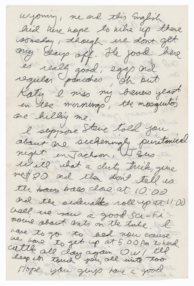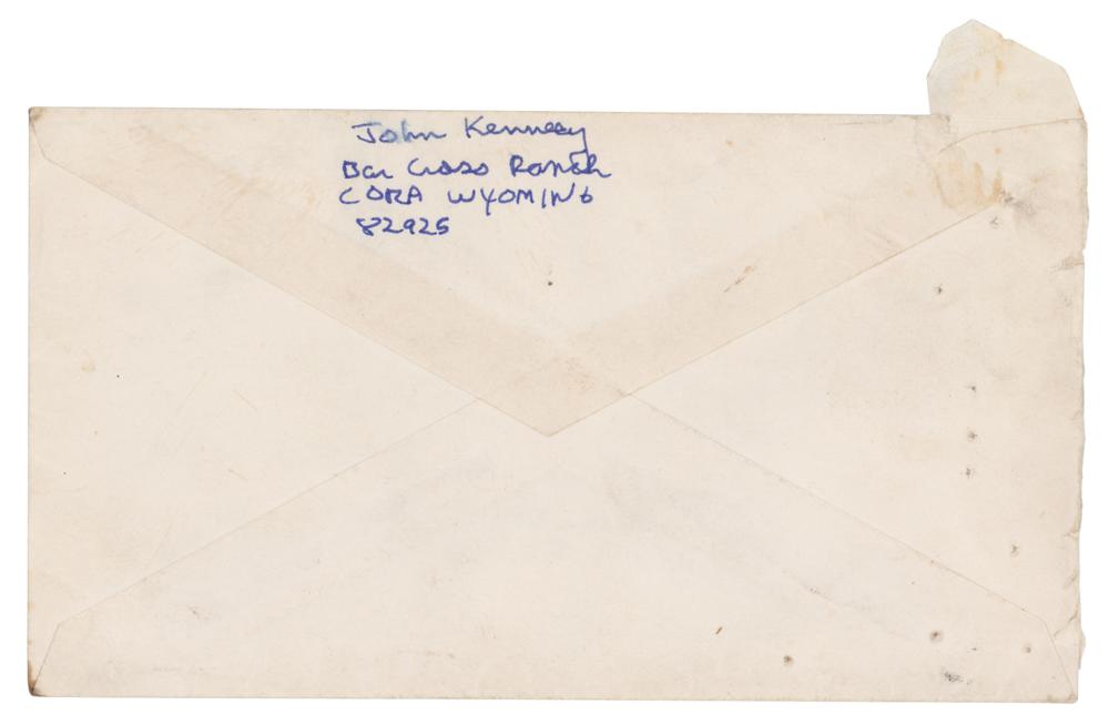 Accompanied by a letter of provenance from the original recipients, counselors from the West Thumb Youth Conservation Corps, who write: “We got to know John because my husband William, in the summer of 1978, was the director of a work camp located in West Thumb, Yellowstone National Park. It was a paid summer work program called Youth Conservation Corps (YCC) and in this case employed high schoolers primarily from Wyoming. Many were Mormon. In June, a 17 year old John Jr. showed up. It was a surprise to all of us on staff and even more so to the other kids. The attention / idolization he received from them might’ve been too much. [His] Mom Jackie called William?after about 10 days and had a phone conversation about this apparent mismatch and decided that her son would do better at the Bar Cross Ranch in Cora, Wyo. It was owned by an acquaintance. She mailed money for a bus ticket from Jackson Hole to the ranch. So about 2 weeks into the session William?drove him to the Jackson bus station.