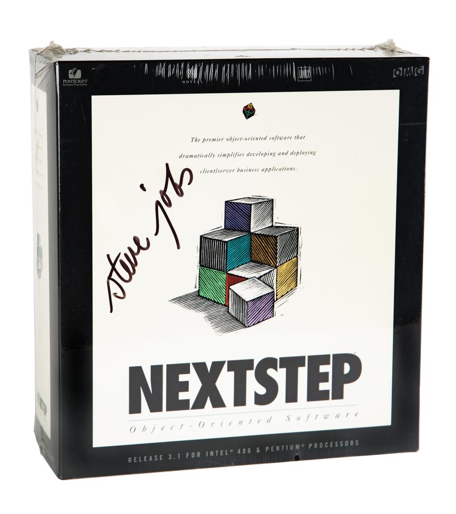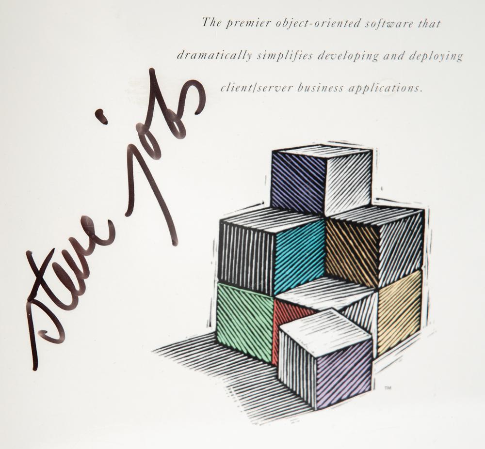 The consignor of this piece was a co-founder of Bindco, the company responsible for designing the NeXTSTEP software packaging, as well as its manufacture, assembly, storage, and shipping. He worked directly with Jobs on the design of the box, which was complicated by the fact that Jobs didn't want any white edges to be visible. When the packaging was ready and the first box of software was produced, Jobs requested that he receive the first copy (i.e. first serial number) of the box of software. After complying with that request, the consignor made a box for himself with the serial #000 (inside the CD digipak) and asked Steve Jobs' assistant to have Steve sign it for him, which Steve did. Bindco then shrink-wrapped the box?complete with software, manuals, and registration card inside?which is the state that it remains in to this day.