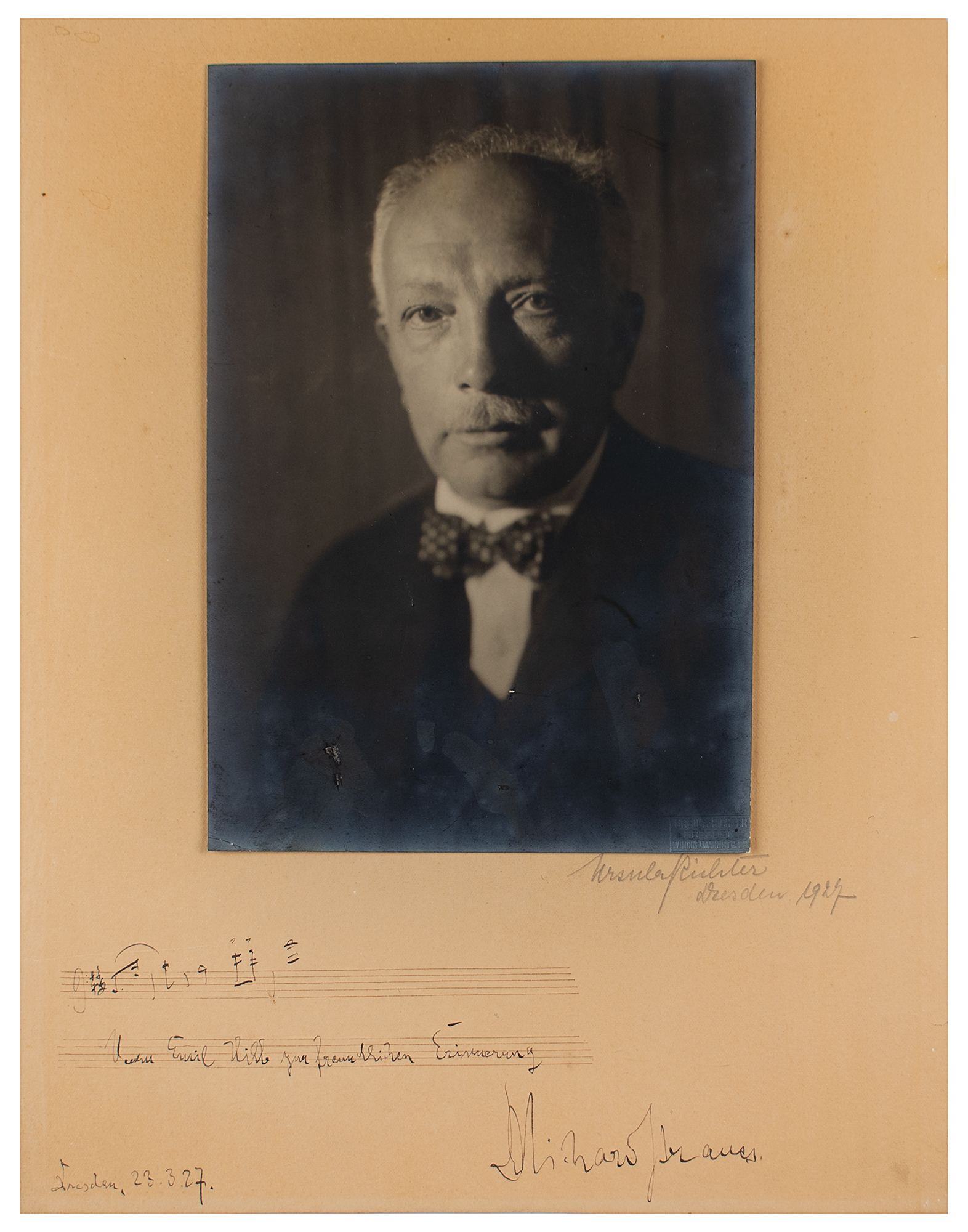 Vintage matte-finish 6 x 8.75 photo of the composer, affixed to a 10.5 x 13.25 mount, signed on the mount in fountain pen with a three-bar musical quotation from 'Der Rosenkavalier,' inscribed below in German and signed, "D. Richard Strauss, Dresden 23.3.27." Also signed in pencil below the image by the photographer, Ursula Richter. In very good to fine condition, with silvering to the photo, and light toning to the mount from prior display.