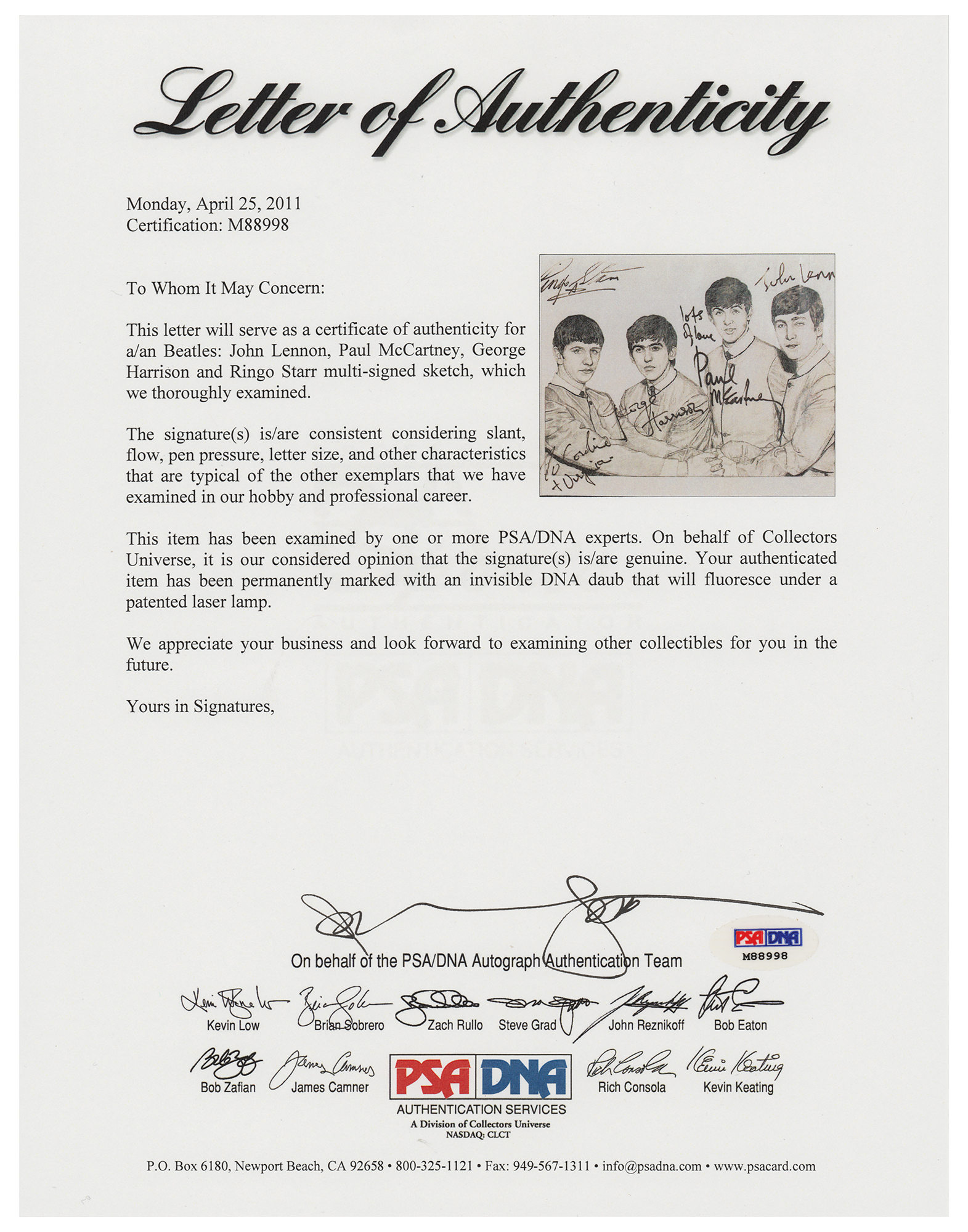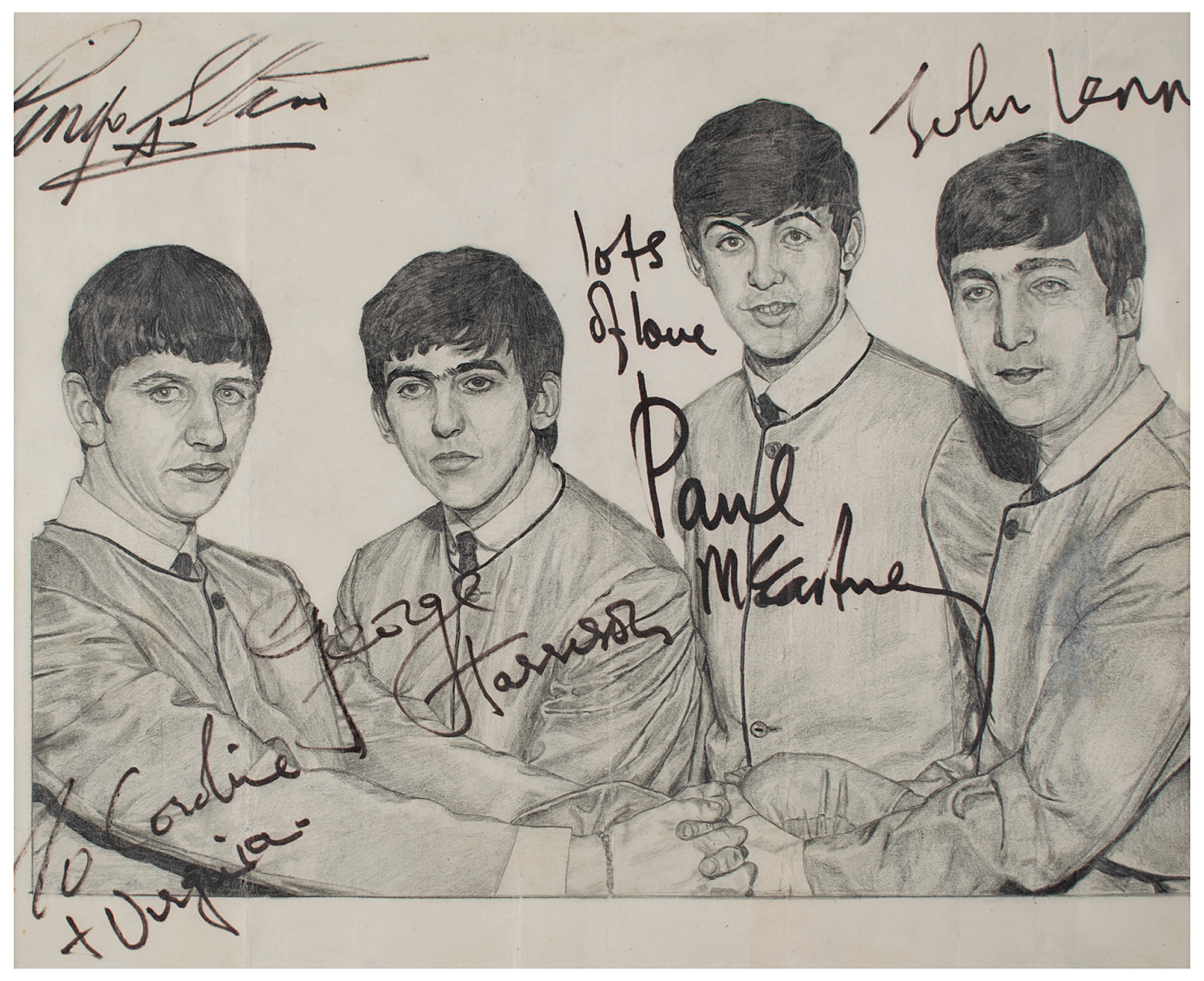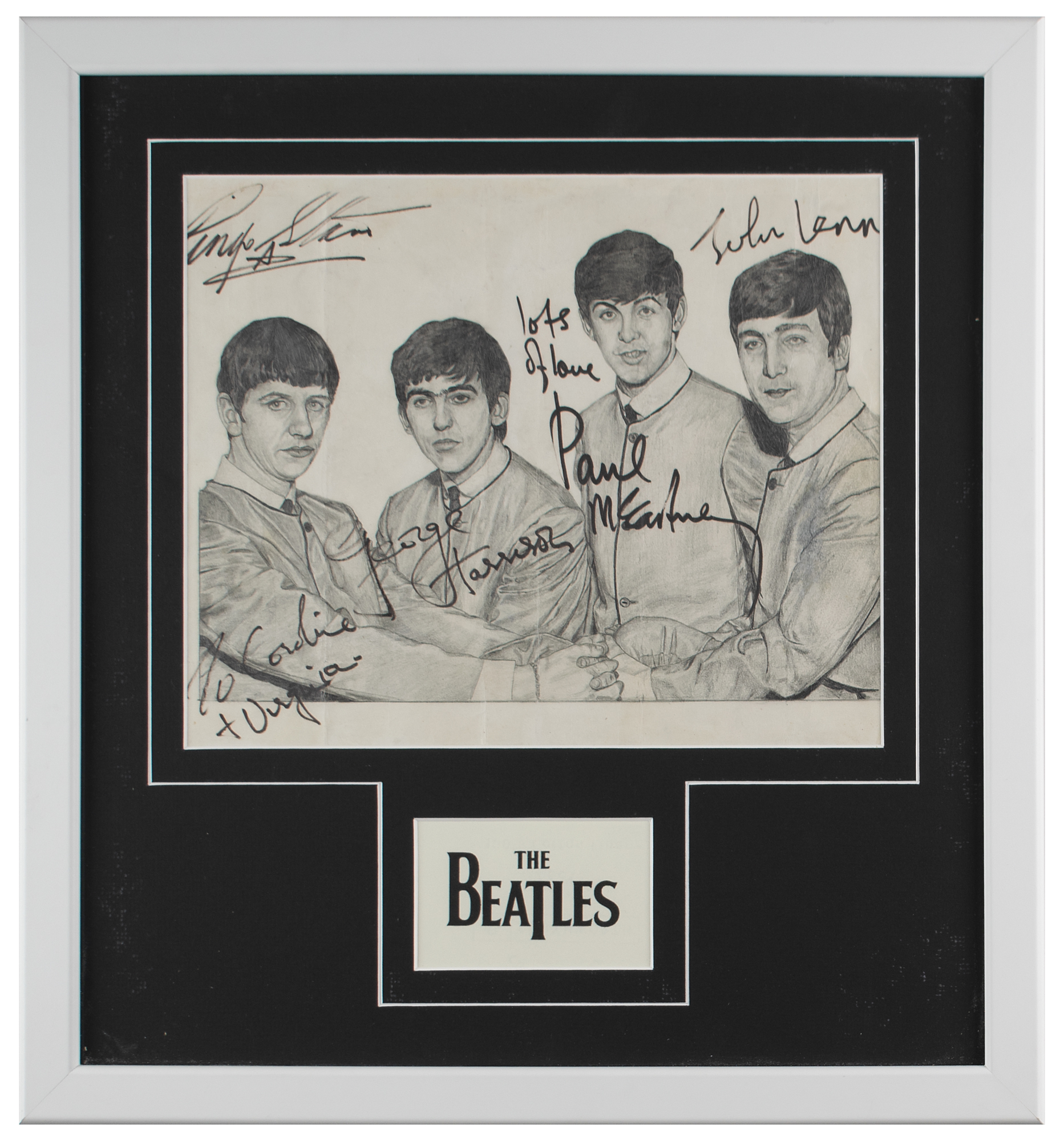 Original sketch of the Beatles in their early mod-style collarless suits, accomplished by a fan in graphite on an off-white 12 x 9.5 sheet, signed and inscribed in black felt tip, "To Caroline + Virginia, George Harrison," "Ringo Starr," "Lots of love, Paul McCartney," and "John Lenn[on]" (last two letters either trimmed off or matted out). Framed and double-matted to an overall size of 17.5 x 18.75. In very good condition, with overall creasing, intersecting folds, and a closely trimmed left edge affecting the opening stroke of Starr's signature. Accompanied by a full letter of authenticity from PSA/DNA. A decidedly bold cast of Fab Four autographs.
