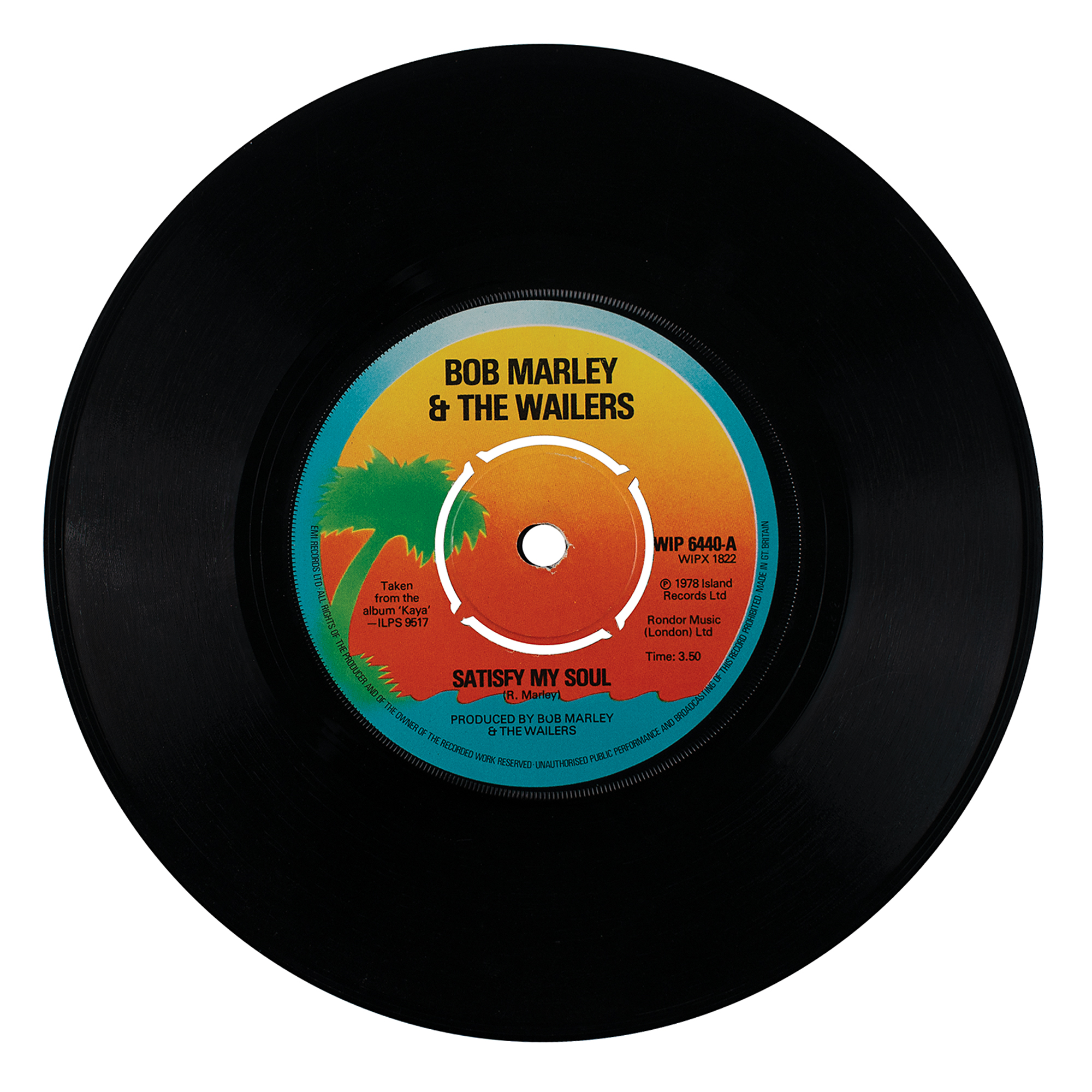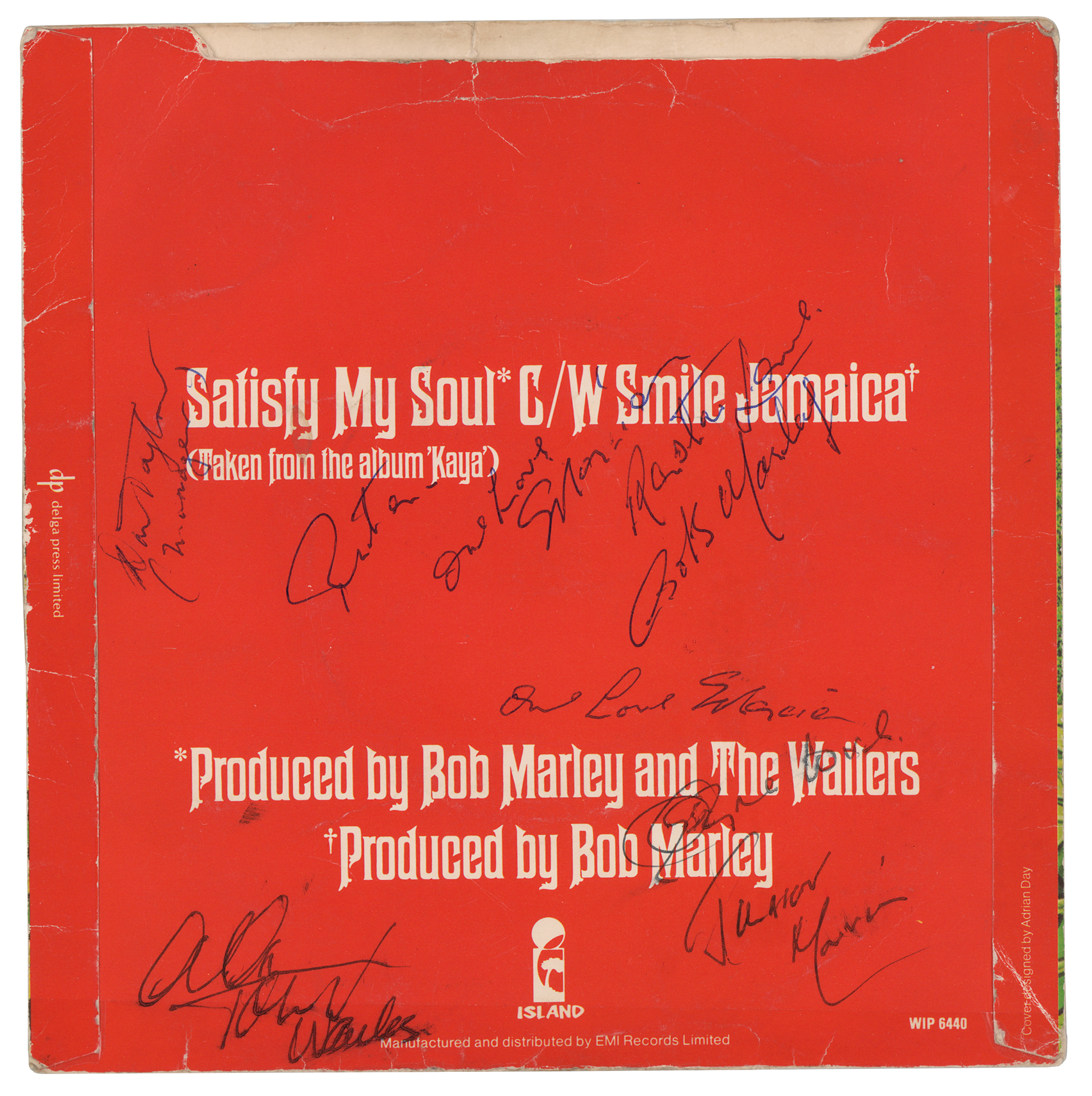 Desirable UK Island Records 45 RPM single for ‘Satisfy My Soul / Smile Jamaica’ by Bob Marley & the Wailers, signed on the reverse of the sleeve in black ballpoint, "Rasta Love, Bob Marley"; twice by backing vocalist Marcia Griffiths, "Rasta—One Love—Marcia" and "One Love, Marcia"; the guitarist, "One Love, Junior Marvin"; Jamaican soccer star and owner of Tuff Gong records, "Allan Cole, Tuff Wailers"; and their manager, "Don Taylor, (Manager)." The front has been signed in black ballpoint by the drummer, "Carlton Barrett, Wailers Drummer"; guitarist, "Earl Smith, Jah Love"; famed bassist, "Aston 'Family Man' Barrett, Bass"; and backing vocalist Judy Mowatt, "Love Always, Judy." In very good to fine condition, with overall creasing, and clear tape along the bottom edge. Accompanied by a certificate of authenticity from Tracks.