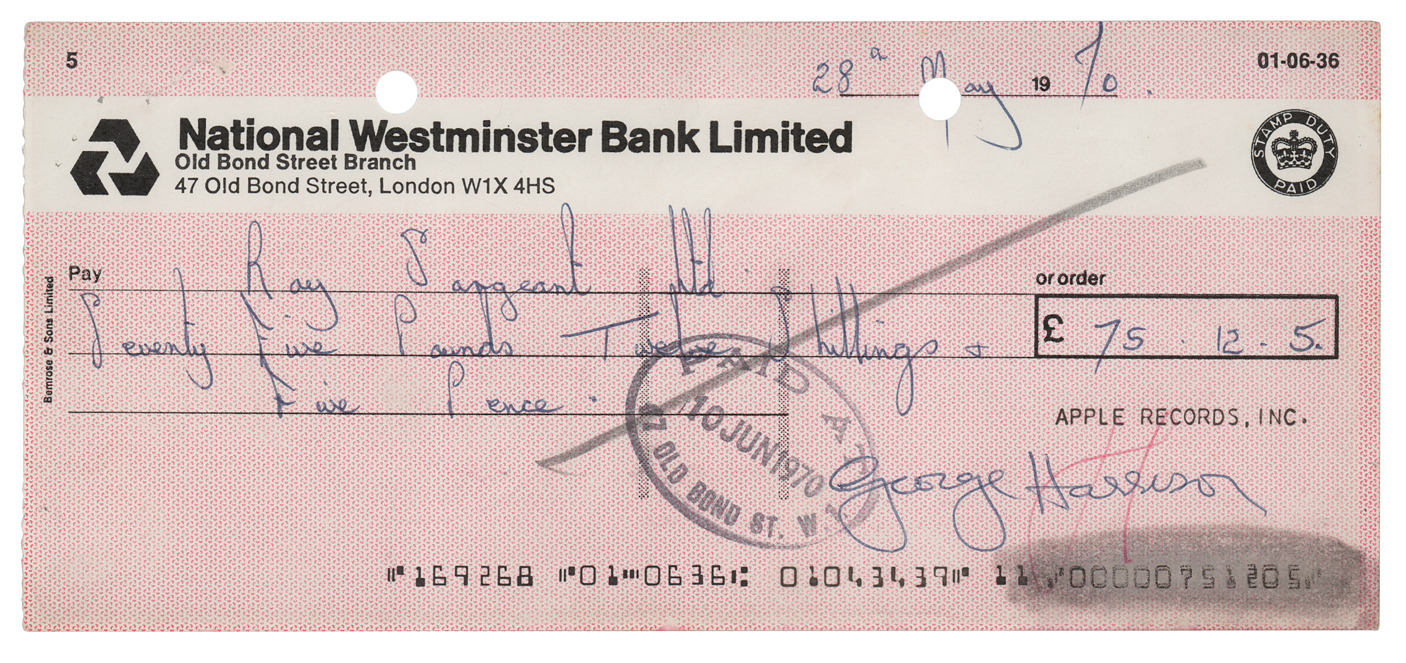 Apple Records, Inc. business check, 8 x 3.5, filled out in another hand and signed by George Harrison, payable to Ray Sargeant Ltd. for £75.12.5, May 28, 1970. In fine condition. Accompanied by a certificate of authenticity from Tracks.