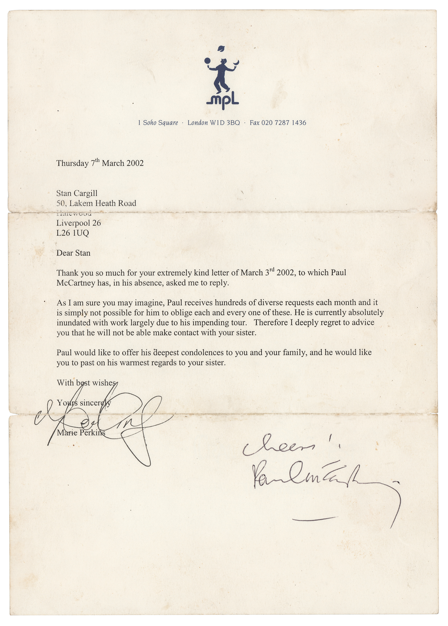 Ballpoint signature, “Cheers! Paul McCartney,” autographed at the bottom of a 8.25 x 11.75 typed letter from MPL Communications, dated March 7, 2002, addressed to Stan Cargill by McCartney’s assistant Marie Perkins, which reads, in part: “As I am sure you may imagine, Paul receives hundreds of diverse requests each month and it is simply not possible for him to oblige each and every one of these. He is currently absolutely inundated with work largely due to his impending tour. Therefore I deeply regret to advise you that he will not be able to make contact with your sister. Paul would like to offer his deepest condolences to you and your family, and he would like to pass on his warmest regards to your sister.” In very good to fine condition, with light soiling and handling wear. Accompanied by the original mailing envelope, and by a certificate of authenticity from Tracks.