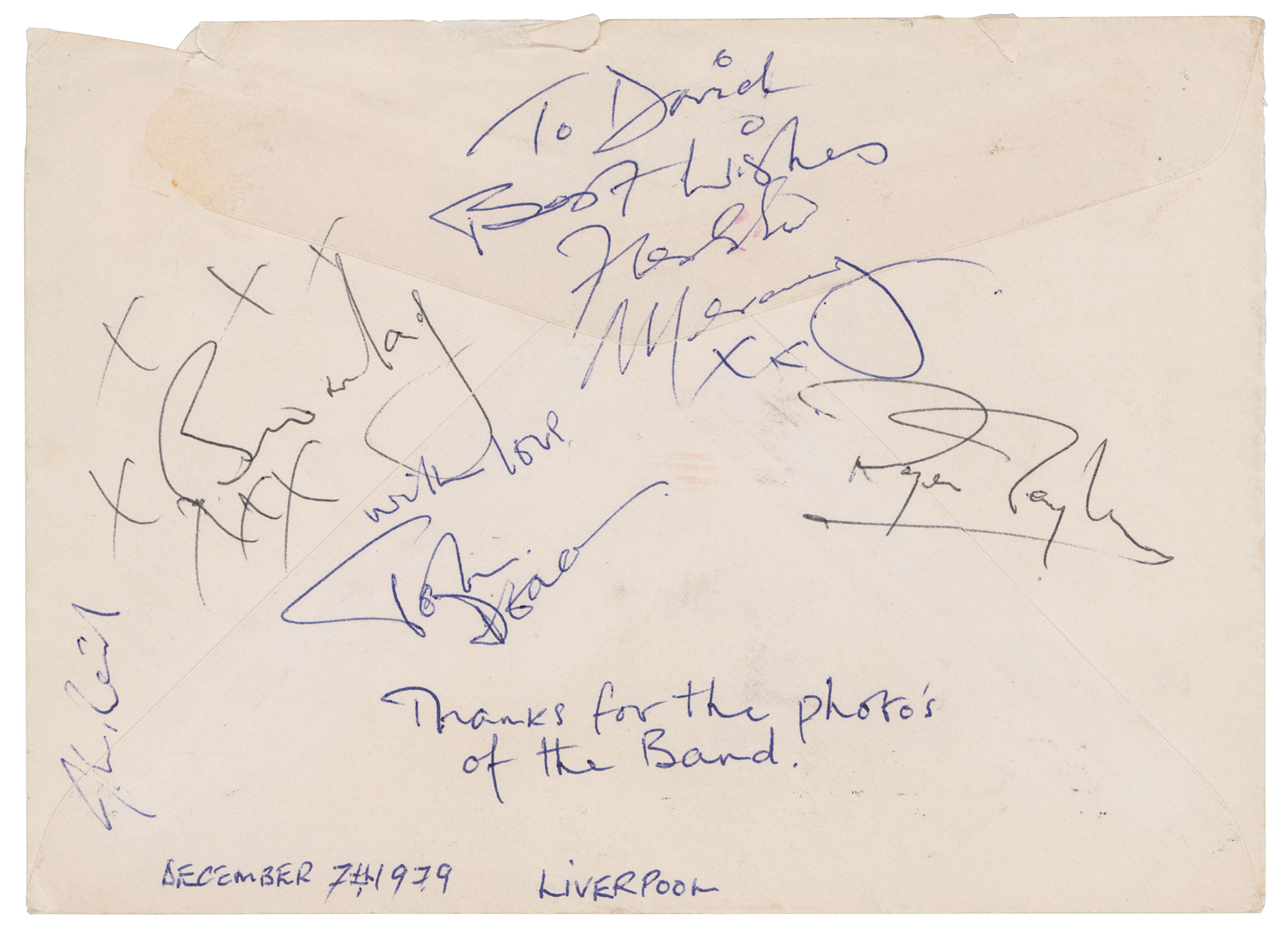 Rare mailing envelope, 7 x 5, signed and inscribed on the reverse in blue ballpoint by Queen and their manager John Reid during their 1979 Crazy Tour: "To David, Best wishes, Freddie Mercury, xx," "Brian May, xxxxxxx," "with love, John Deacon, Thanks for the photo's of the Band," "Roger Taylor," and "John Reid." Annotated along the bottom by a collector, "December 7th, 1979." In fine condition. Accompanied by a certificate of authenticity from Tracks, noting that the autographs were obtained backstage at the Empire Theatre, Liverpool, England on December 7, 1979, after the recipient had presented the band with some photographs.