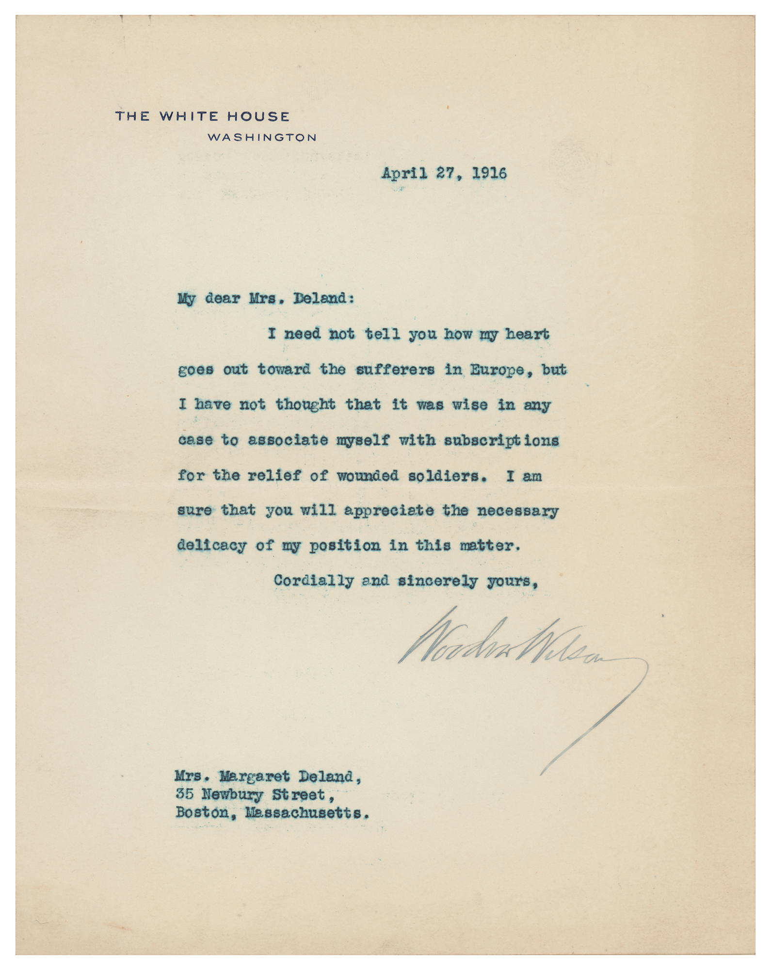 TLS as president, one page, 7 x 8.75, White House letterhead, April 27, 1916. Letter to novelist Margaret Deland, who would be awarded a cross from the Legion of Honor for her relief work in France during World War I. In full: "I need not tell you how my heart goes out toward the sufferers in Europe, but I have not thought that it was wise in any case to associate myself with subscriptions for the relief of wounded soldiers. I am sure that you will appreciate the necessary delicacy of my position in this matter." In fine condition. It was not until a year later, on April 6, 1917, the United States entered World War I.
