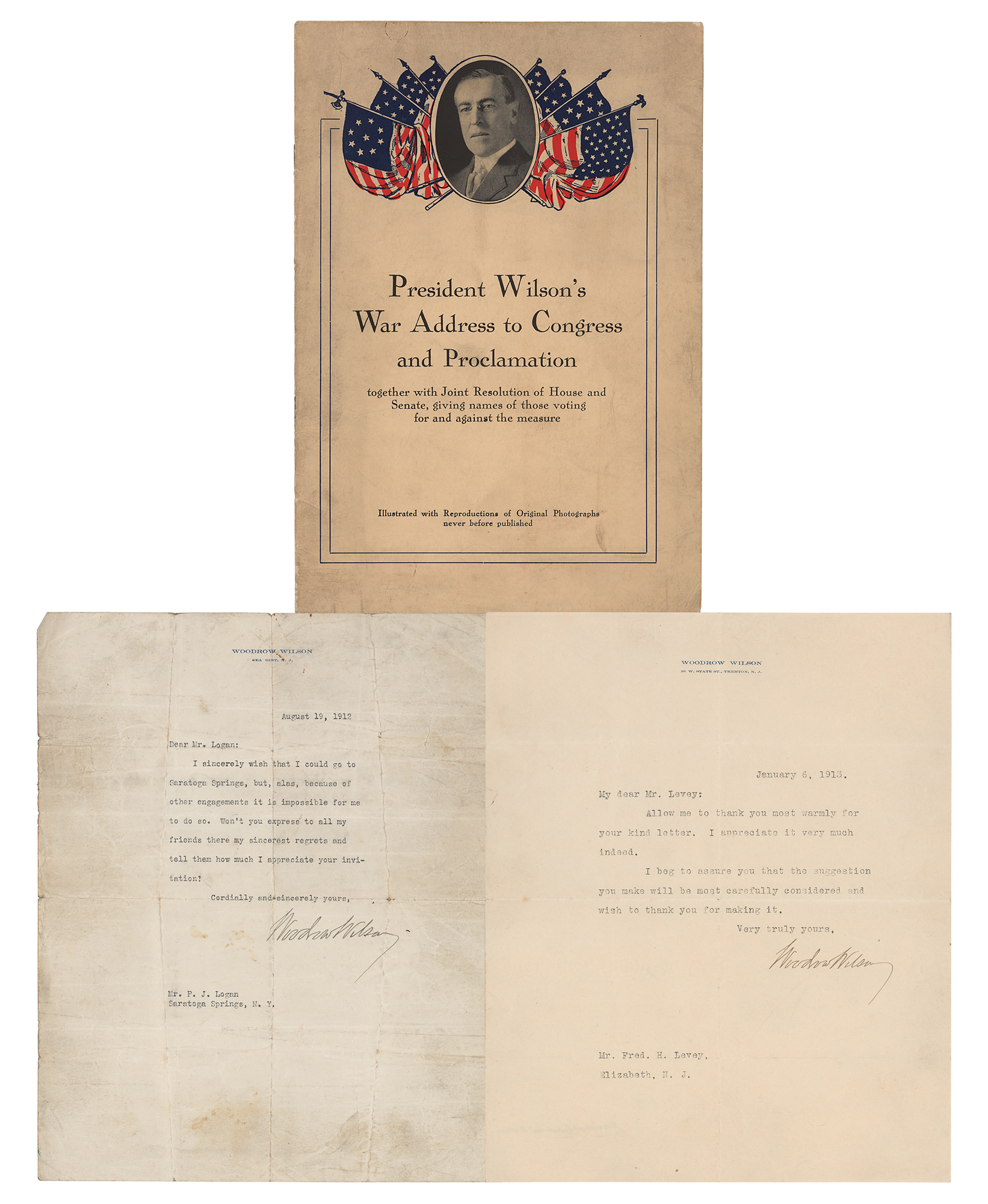 Two TLSs, each one page, 8 x 9.75, personal letterhead, dated August 19, 1912 and January 6, 1913. The first, to P. J. Logan in Saratoga Springs, in full: "I sincerely wish that I could go to Saratoga Springs, but, alas, because of other engagements it is impossible for me to do so. Won't you express to all my friends there my sincerest regrets and tell them how much I appreciate your invitation?" The second, to Fred H. Lavey, in part: "Allow me to thank you most warmly for your kind letter. I appreciate it very much indeed. I beg to assure you that the suggestion you make will be most carefully considered and wish to thank you for making it." In overall very good condition, with heavy creasing and staining to the earlier letter. Accompanied by a booklet entitled 'President Wilson's War Address to congress and Proclamation.'