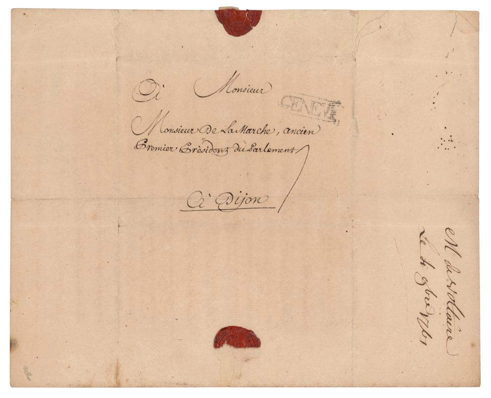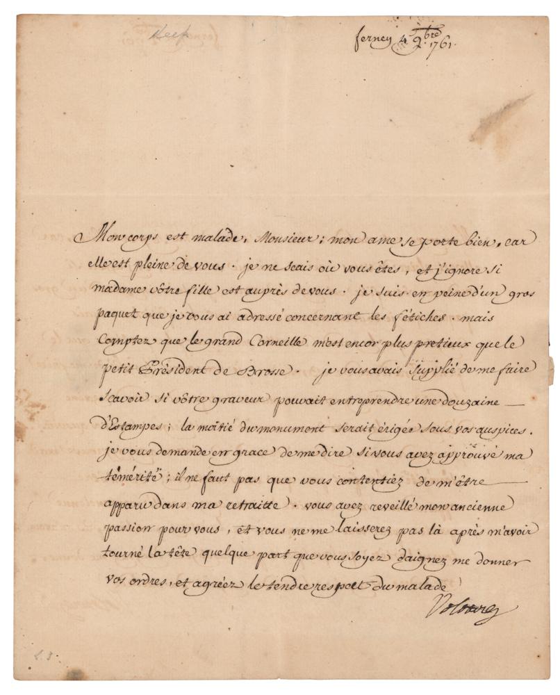 LS in French, signed "Voltaire," one page, 7.5 x 9.25, November 4, 1761. Letter to Claude-Philippe Fyot de La Marche, in full (translated): "My body is ill, Monsieur; my soul is well, because it is full of you. I do not know where you are, and I am ignorant of whether Madame your daughter is with you. I am at a loss about a large packet that I sent you concerning fetishes, but you may be sure that the great Corneille is still more precious to me than the little President de Brosse. I had requested that you let me know whether your engraver could undertake a dozen prints; half of the monument would be set up under your auspices. I ask as a favor that you tell me whether you have approved my boldness; it need not be the case that you are content to have appeared to me in my retreat. You have reawakened my old passion for you, and you will not leave me there after having turned my head. Wherever you are, have the kindness to give me your orders, and accept the tender respects of an ill man." In fine condition, with scattered light stains.