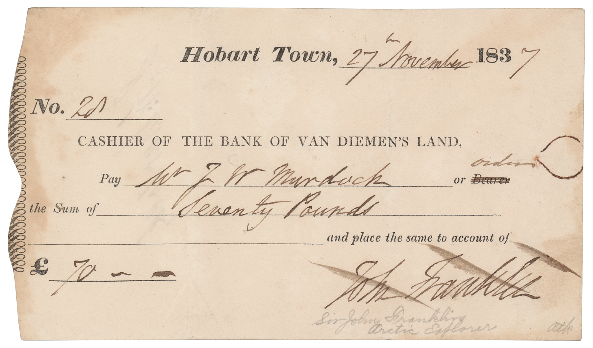 Royal Navy officer and Arctic explorer (1786-1847) who perished, along with his entire crew, along the Northwest Passage. Bank of Van Diemen's Land check, 7 x 4, filled out and signed by John Franklin, payable to J. W. Murdock for £70, November 27, 1837. In fine condition, with light staining to the side edges.
