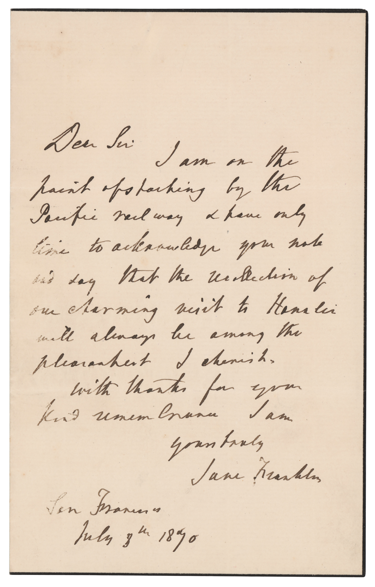 Second wife (1791-1875) of the English explorer Sir John Franklin, known for her philanthropic work, her travels throughout south-eastern Australia, and her sponsorship of search expeditions after her husband's disappearance while seeking the Northwest Passage. Rare ALS signed “Jane Franklin,” one page, 4.5 x 7, July 3, 1870. Handwritten letter to a gentleman, written from San Francisco. In full: "I am on the point of starting by the Pacific railway & have only time to acknowledge your note and say that the recollection of one charming visit…will always be among the pleasantest I cherish." In fine condition.