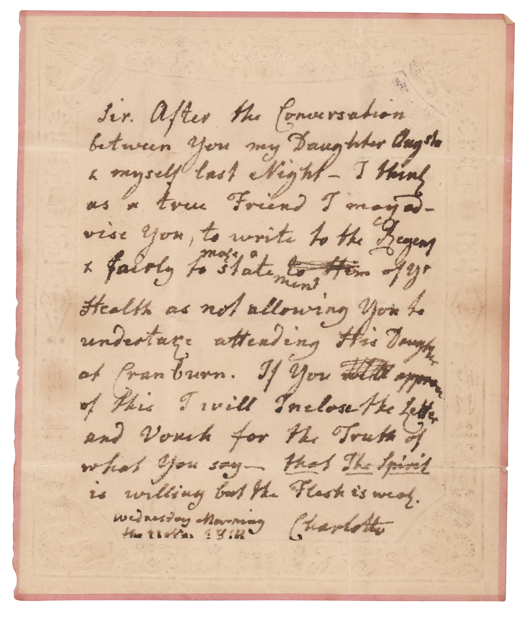 Queen of Great Britain and Ireland as the wife of King George III, remembered as a patroness of the arts and amateur botanist (1744-1818). ALS signed “Charlotte,” one page, 4 x 4.75, no date. Handwritten letter to a gentleman, in full: "After the Conversation between you my Daughter Aug'sta & myself last Night—I think as a true Friend I may advise you, to write to the Regent & fairly to make a statement of yr Health as not allowing you to undertake attending His Daughter at Cranburn. If you approve of this I will Inclose the Letter ad vouch for the Truth of what you say—that the Spirit is willing but the Flesh is weak." In fine condition.