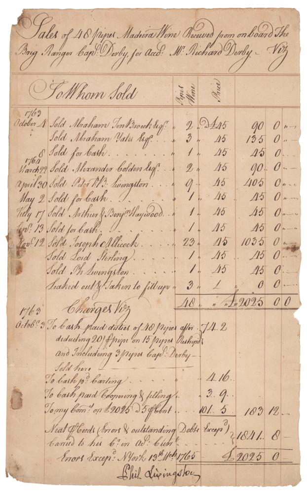 Signer of the Declaration of Independence from New York (1716-1778). Manuscript DS, signed “Phil. Livingston,” one page, 7.75 x 12.5, March 13, 1765. Accounting document headed "Sales of 48 pipes Madeira Wine Received from on board The Brig. Ranger Capt. Derby, for Acct: Mr. Richard Derby," tallying up the payments of various buyers, amounting to a total of £2025. Boldly signed at the conclusion by Livingston. In very good to fine condition, with scattered stains, edge tears, and splitting to the folds.